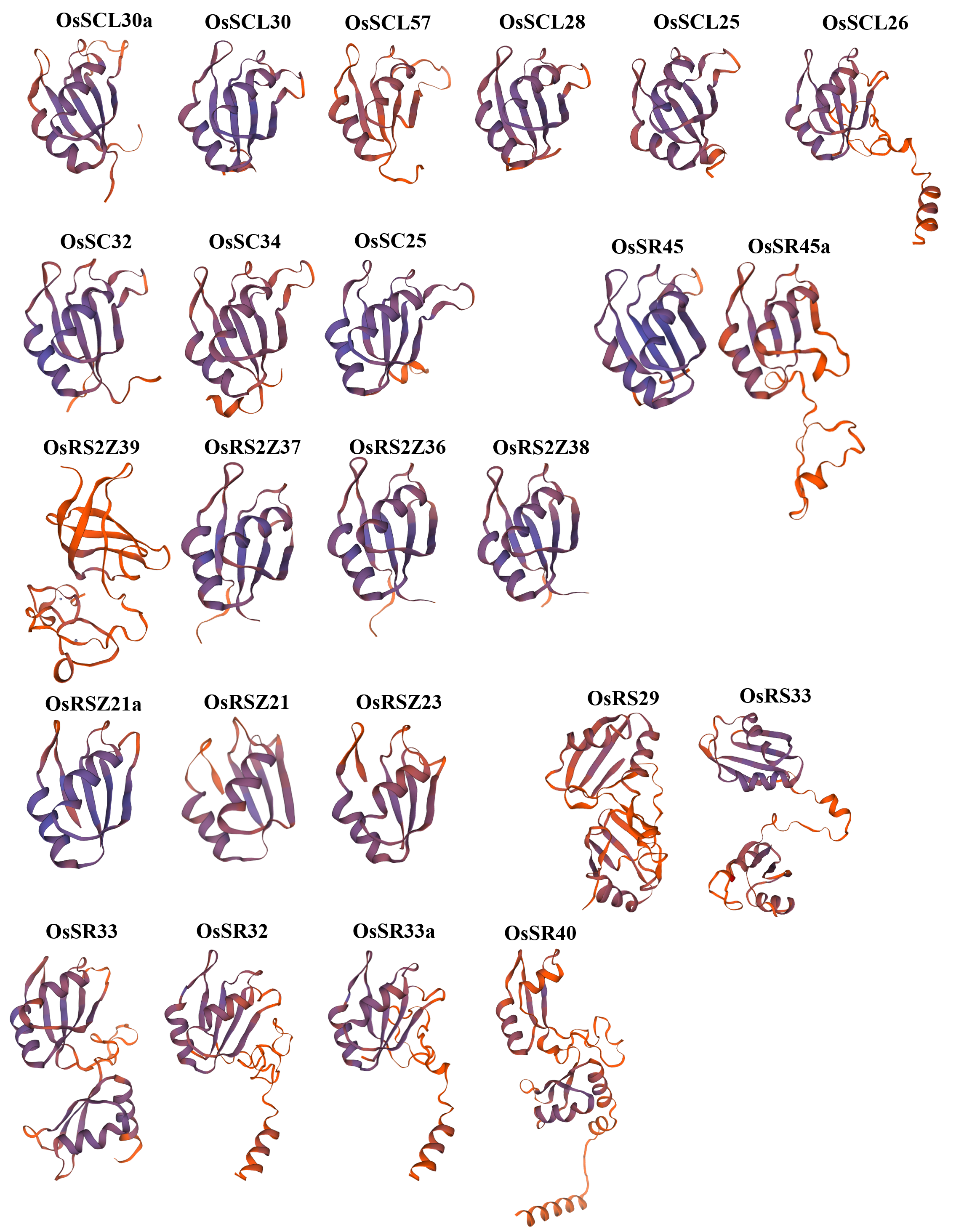 Predicted three-dimensional domains of OsSR proteins. 3D models of the 24 OsSR proteins according to SWISS-MODEL.