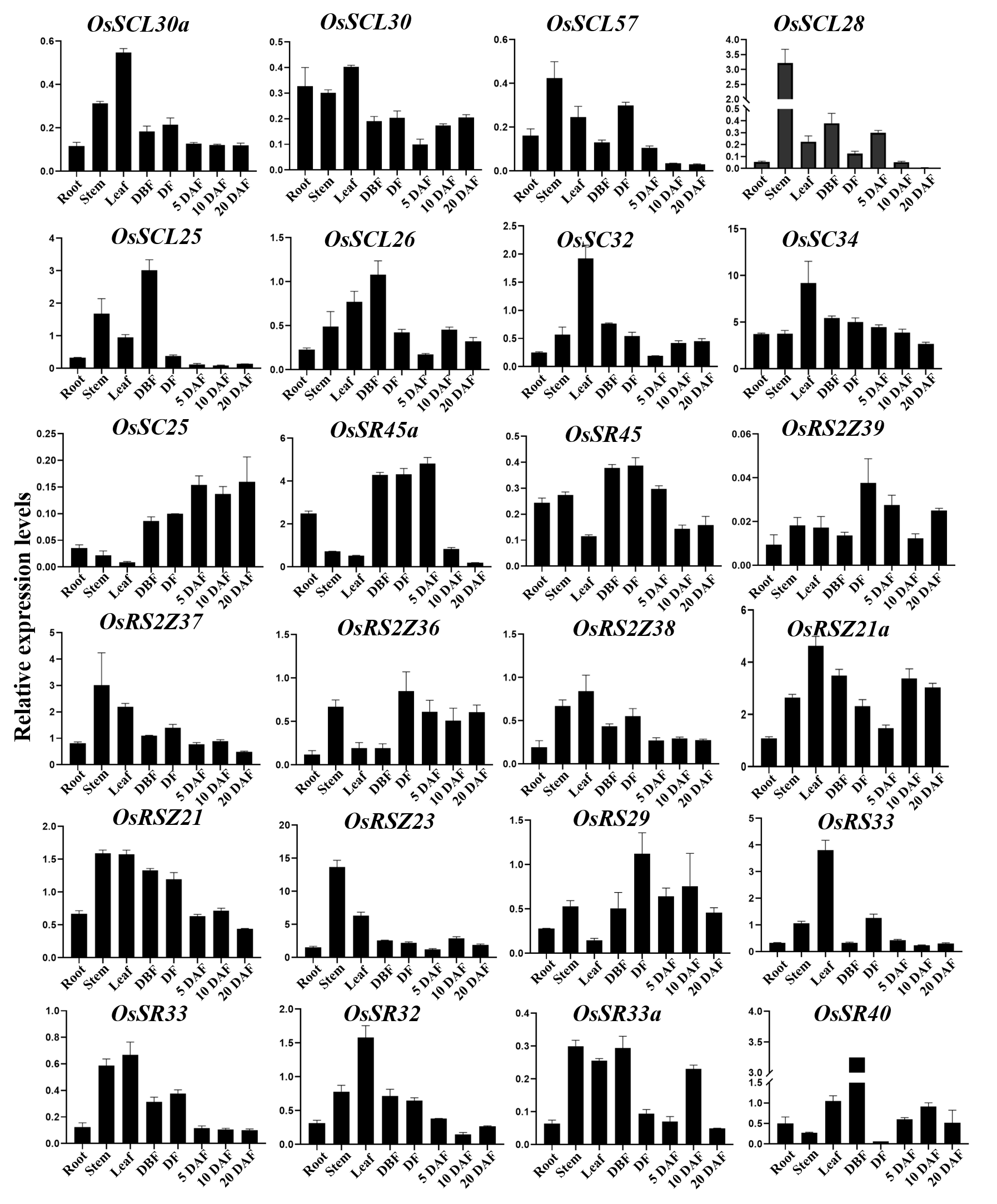 To further characterize the potential biological function, qRT-PCR was used to conduct tissue-specific expression analyses of OsSR genes. Totally, we detected all 24 OsSR genes in eight tissues and organs including root, stem, leaf and spikelets before fertilization, at flowering and 5, 10 and 20 days after fertilization (Table S9). Our results showed that the expression of the OsSR genes was tissue-specific and development phase-dependent (Fig. 5 and Fig. S3). The genes in the SCL subfamily were mainly expressed in stems, leaves and young panicles, and showed a lower expression in grains after 5 days of pollination. Notably, the expression of OsSC32 and OsSC34 in SC subfamily showed leaf preferential expression, whereas the expression of OSC25 was very low in the tested tissues. The OsSR45a in the SR45 subfamily was specifically higher expressed in panicles at DBF, DF, and 5 DAF, while the expression level of OsSR45 was relatively high only in panicles at DF. As for the genes in the RS2Z subfamily, the expression of OsRS2Z39 almost failed to be detected in both vegetative and reproductive organs. Among the remaining three genes in the RS2Z subfamily, OsRS2Z38 was mainly expressed in the stems, leaves, and panicles before flowering, while OsRS2Z36 was highly detected in panicles during the filling period, and OsRS2Z37 was expressed with a relative high level in all tested tissues. The ubiquitous expression of three genes in the RSZ subfamily was observed in 8 tissues with relatively high levels, especially in stems, leaves, and grains after 10 days of fertilization. Furthermore, two RS subfamily genes were highly expressed in panicles at different developmental stages. The high expression in leaves and panicles at DBF was observed for four genes in the SR subfamily.