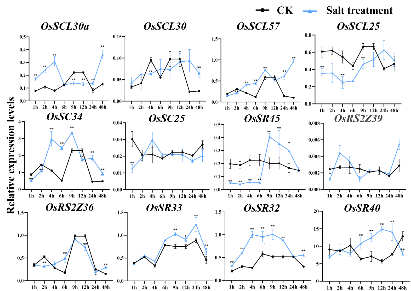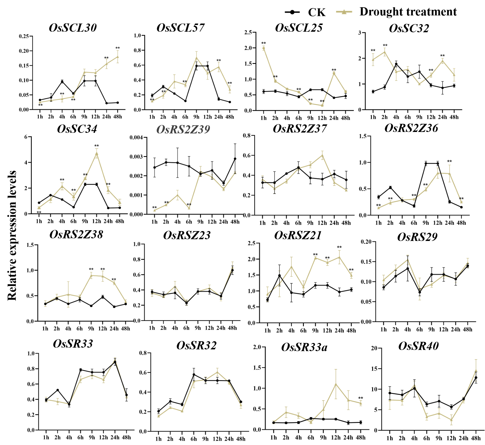 OsActin was used as control. Error bars represent mean ± SE of three biological replicates. ∗P < 0.05 and ∗∗P < 0.01 indicate significant differences compared with CK determined by Student’s t-test.Under drought stress (Fig. 7B), there was the evident increase in the expression level of OsSCL28, OsSCL26, OsSR45a, and OsRSZ21a after treatment for 1 h to 2 days. Different OsSR genes were responsive to drought with various degrees. The expression levels of OsSC25, OsSR45, OsRSZ21, and OsRS33 were considerably up-regulated from 2 h, 9 h, 9 h, and 4 h after treatment, respectively, while OsSCL30a was up-regulated within 4 h of treatment, and the suppressed expression of OsSCL30a was observed after drought treatment for 9 h. The remaining OsSR genes exhibited no obvious patterns in response to drought stress (Fig. S5).