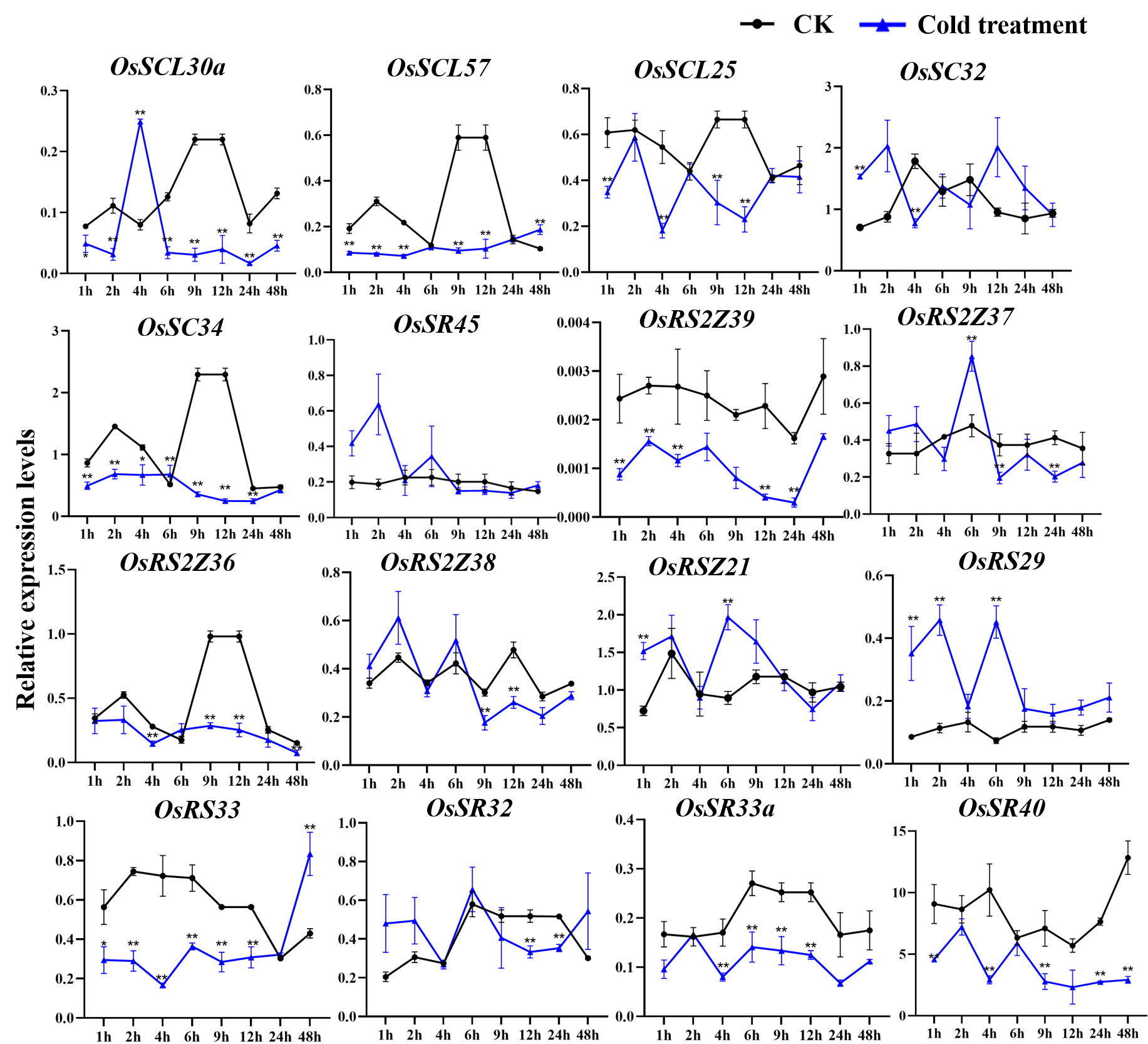 The expression of OsSC25, OsSR45a, OsRSZ21a, and OsSR33 were induced by the cold treatment (Fig. 8A). The induced expression of OsSC25 peaked at 6 h after treatment. The induction of OsSR45a was strong, the expression level of OsSR45a increased by more than 10 times compared to the control within 1 h to 9 h after treatment. Under cold stress, the expression levels of OsSCL30, OsSCL28, OsSCL26, and OsRSZ23 were remarkably decreased. The OsRSZ23 showed an exaggerated response to the cold treatment, its expression was almost completely suppressed under low temperature. Furthermore, the expression levels of other OsSR genes fluctuated, but the changes were slight between treatment and control (Fig. S6).