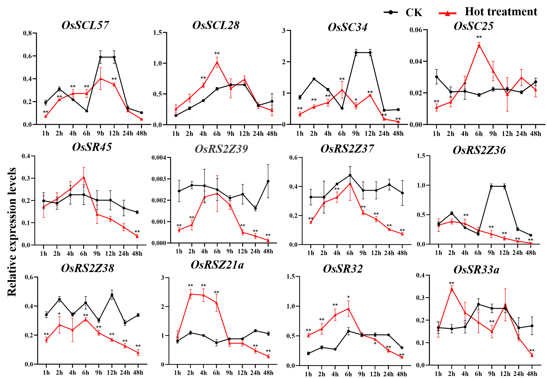 OsActin was used as control. Error bars represent mean ± SE of three biological replicates, ∗P < 0.05 and ∗∗P < 0.01 indicate significant differences compared with CK determined by Student’s t-test.The OsSR genes were responsive to high temperature with various patterns and degrees (Figs. 8B and S7). Heat treatment induced the significant down-regulation of OsSCL30a, OsSCL30, OsSCL26, OsRS2Z37, OsRSZ23 and OsRS33 (Fig. 8B). Notably, the expression of OsSCL26 gene was almost completely suppressed under heat stress. The results showed that heat treatment significantly upregulated the expression of OsSCL25 and OsSC32 for 1 h to 2 days (Fig. 8B). After exposure to heat stress within 6 h, the expression of OsSR45a was remarkably induced, and it was observed to be down-regulated after 9 h of treatment. The expression of OsRS29 was up-regulated within 1 day of heat treatment and began to decrease after 1 day. The response of OsRSZ21 and OsSR33 to heat stress appeared after 9 h of treatment, showing a significant down-regulation (Fig. 8B).