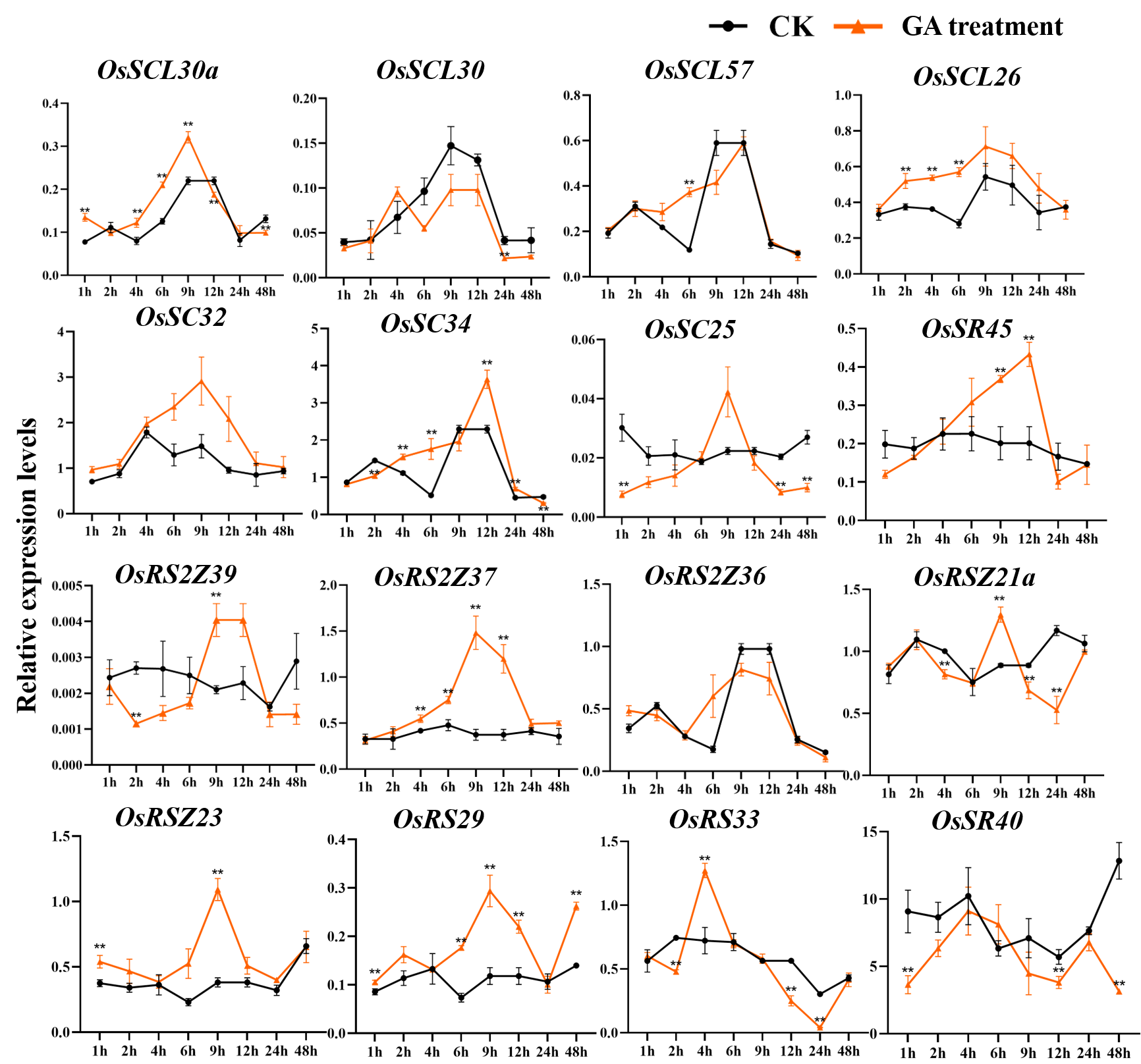 The expression patterns of OsSR genes under different phytohormone treatments were investigated by qRT-PCR (Figs. 9, S8, S9, Tables S10 and S15–S16). We focused on two hormones, ABA and GA, which are essential for plant growth and development. The results showed that OsSCL25, OsRSZ21 and OsSR33a were significantly induced by GA. OsSCL28, OsSR45a, OsSR32 and OsSR33 were induced by GA after treatment for 1 h to 12 h (Fig. 9A), the induced peak values appeared at about 9 h. After being treated with GA for approximately 5 h, there was a considerable decrease in the expression level of OsRS2Z38, then the level gradually increased from 24 h time point and recovered to the similar level compared to the control at 48 h time point (Fig. 9A).