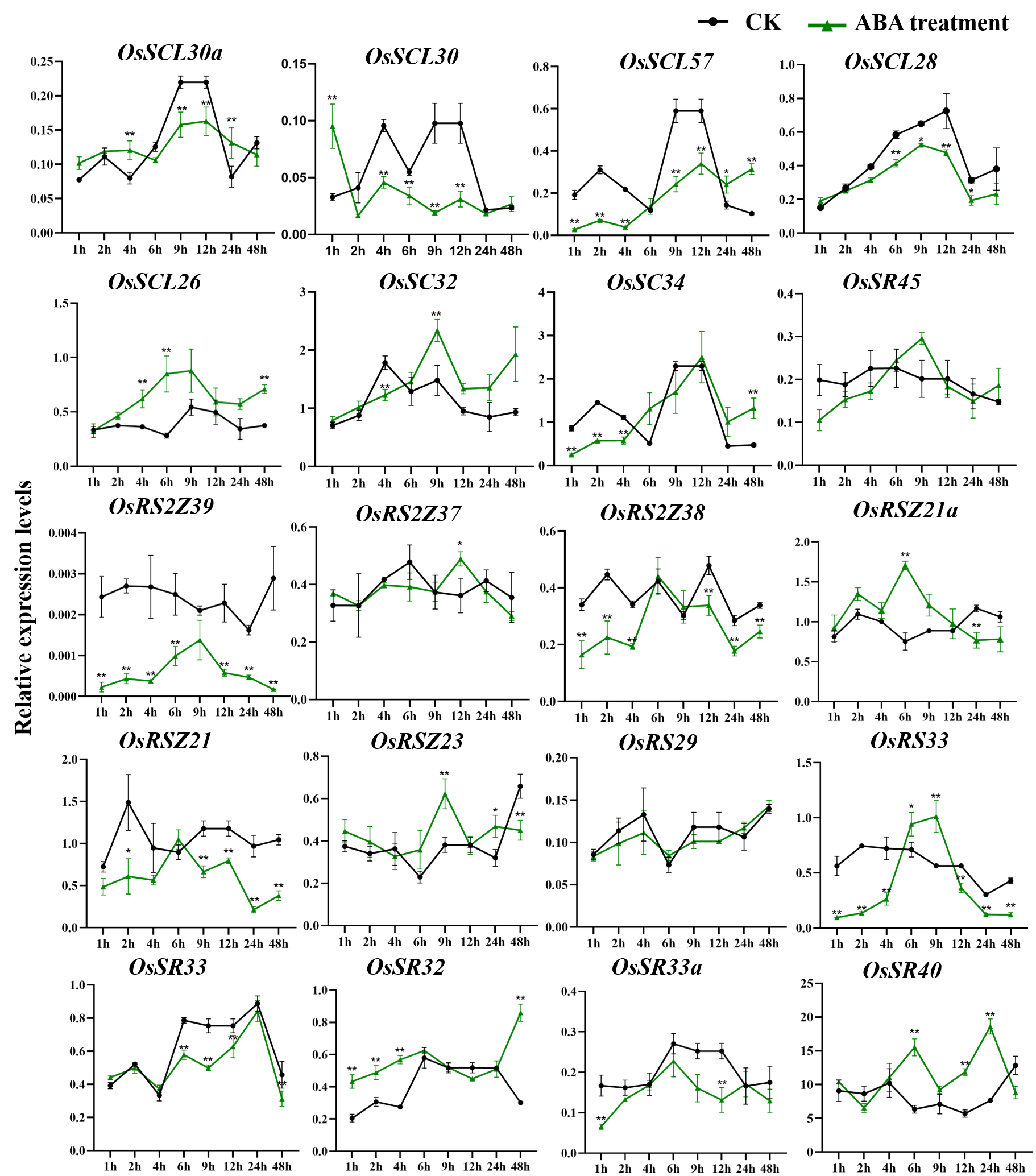 OsActin was used as control. Error bars represent mean ± SE of three biological replicates. ∗P < 0.05 and ∗∗P < 0.01 indicate significant differences compared with CK determined by Student’s t-test.Only a few OsSR genes showed obvious response patterns under exogenous ABA treatment. As compared with the expression under mock treatment, the ABA treatment resulted in a significant increase in that of OsSCL25 and OsSR45a, while the change in expression of OsRS2Z36 was found to be inverse, which was shown to be suppressed by ABA treatment (Fig. 9B).