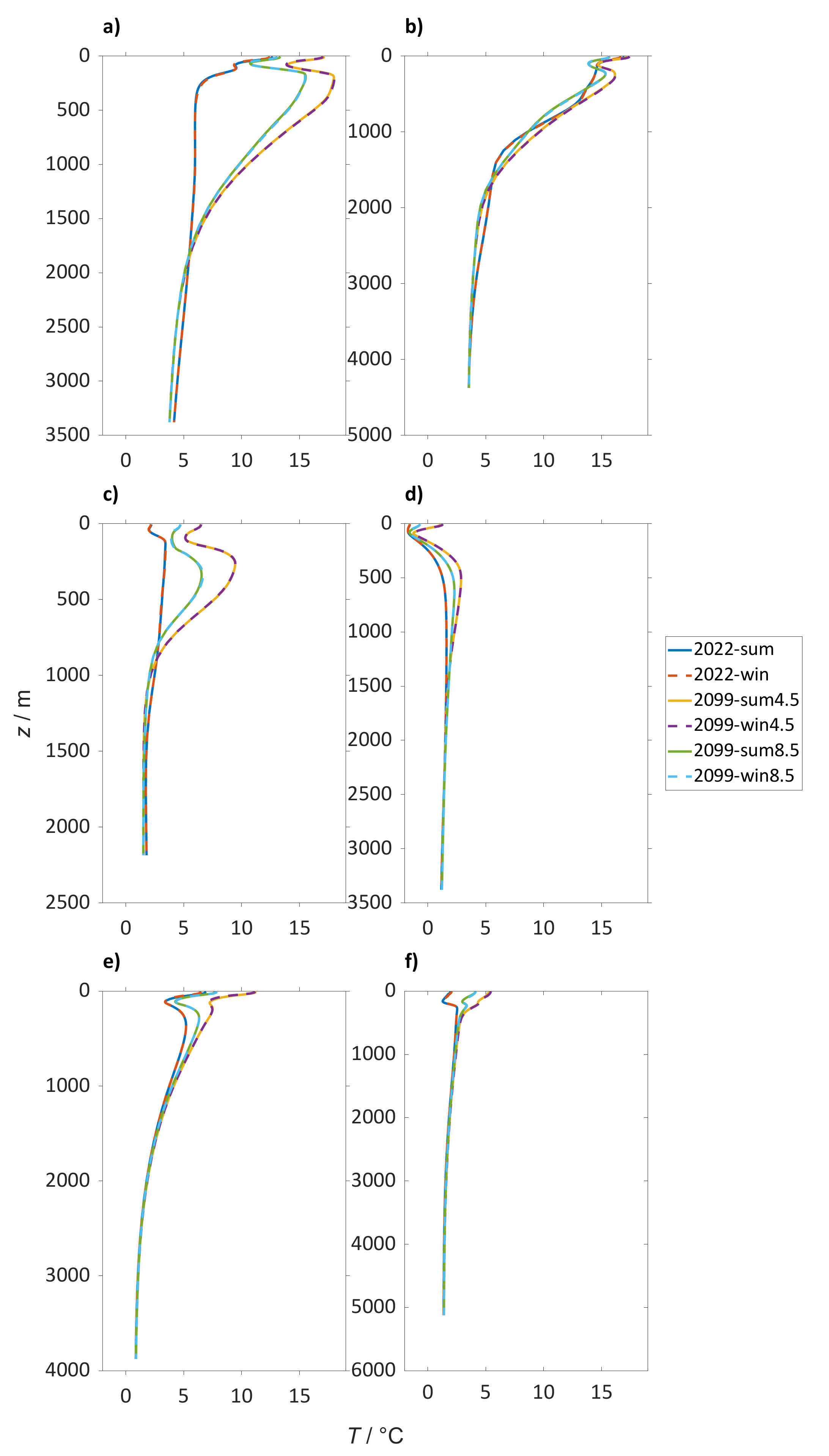 Seawater temperature (T) in ° C profiles over depth for the winter (dashed lines) and summer season (continuous lines) where in blue is boreal summer (2018 to 2022), in red winter (2018 to 2022), in yellow summer (2094 to 2098) and in purple winter (2094 to 2098) for SSP5-8.5 and green and azure for summer and winter (2094 to 2098) for SSP2-4.5 for a) Northwest Atlantic Ocean (45° N 40° W), b) Northeast Atlantic Ocean (47° N 14° W), c) Norwegian Sea (72° N 1° W), d) Arctic Ocean (75° N 140° W), e) North Pacific Ocean (50° N 167° E) and f) Southern Ocean (60° S 25° E).