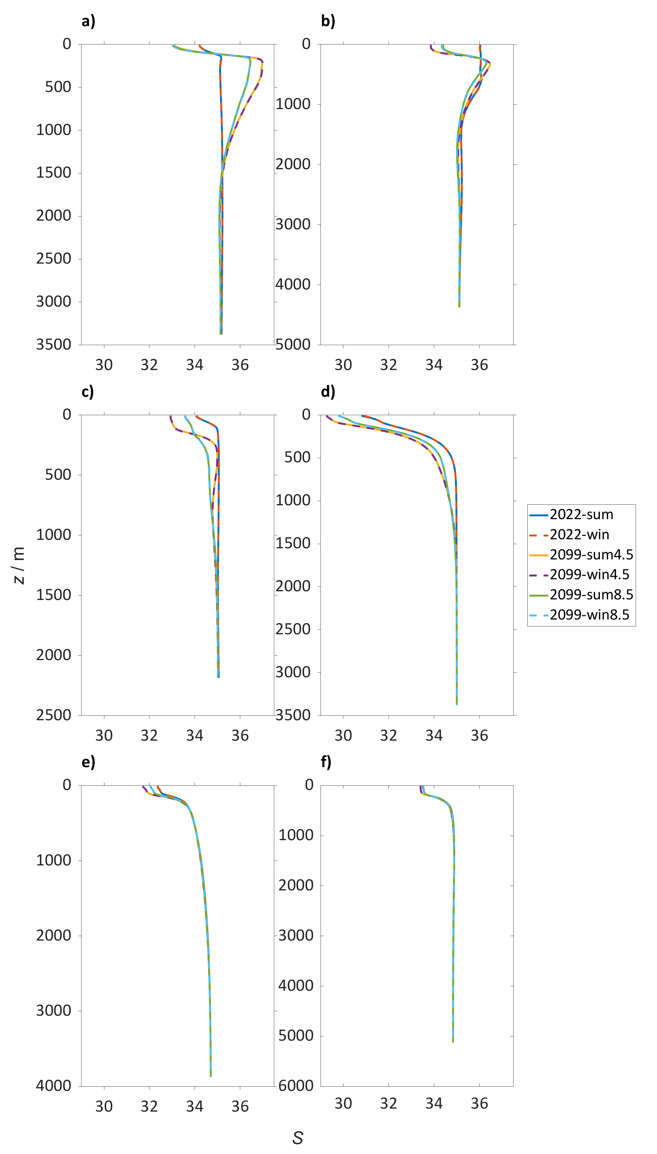 Salinity (S) profiles over depth for the winter (dashed lines) and summer season (continuous lines) where in blue is boreal summer (2018 to 2022), in red winter (2018 to 2022), in yellow summer (2094 to 2098) and in purple winter (2094 to 2098) for SSP5-8.5 and green and azure for summer and winter (2094 to 2098) for SSP2-4.5 for a) Northwest Atlantic Ocean (45° N 40° W), (b) Northeast Atlantic Ocean (47° N 14° W), (c) Norwegian Sea (72° N 1° W), (d) Arctic Ocean (75° N 140° W), (e) North Pacific Ocean (50° N 167° E) and (f) Southern Ocean (60° S 25° E).