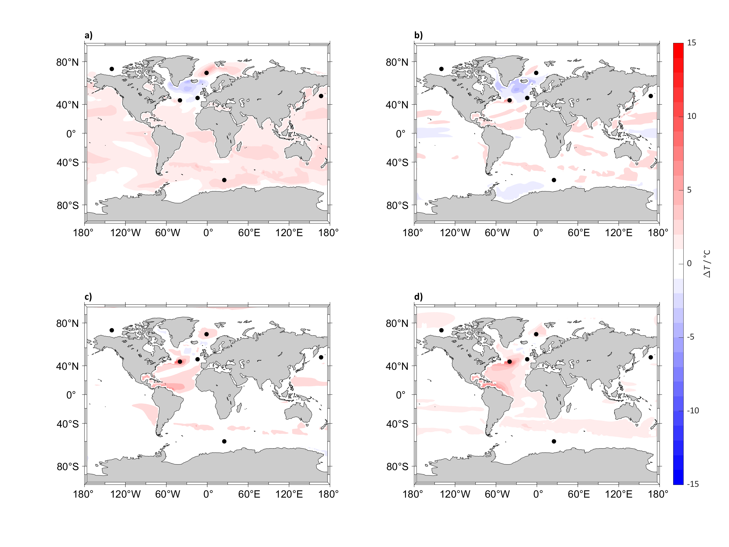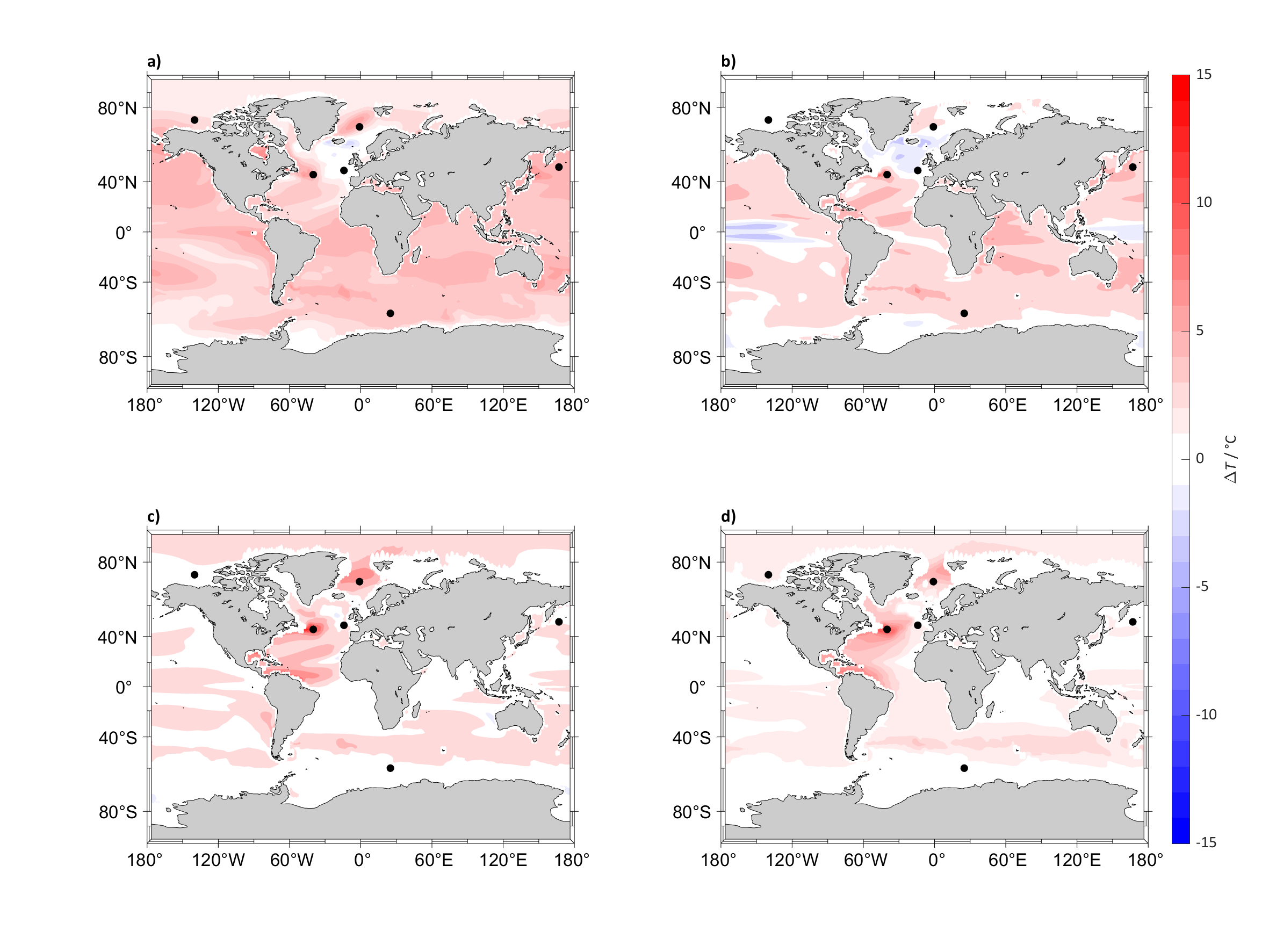 Maps of the difference in 5 years mean of seawater temperature (T) in ° C between (2018 to 2022) and (2094 to 2098) at (a) 5 m, (b) 125, (c) 300 and (d) 640 m depth calculated for SSP5-8.5. The black dots indicate the sound source locations.