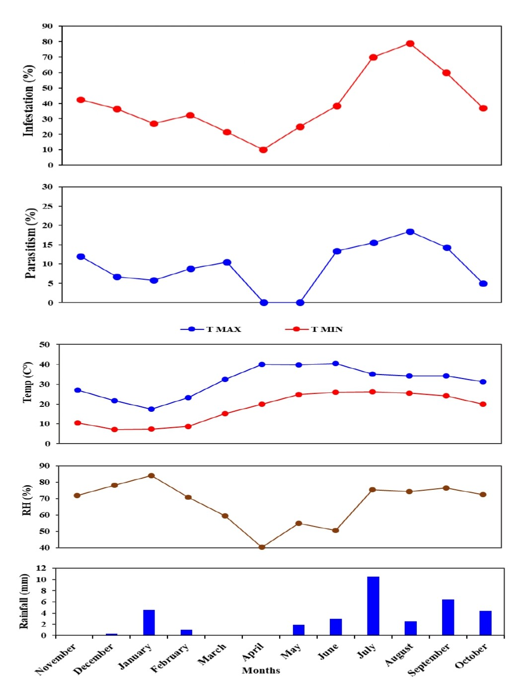Figure 6: Parasitism (%) of all parasitoid species on L. orbonalis during two seasons (November 2021 to October 2022).