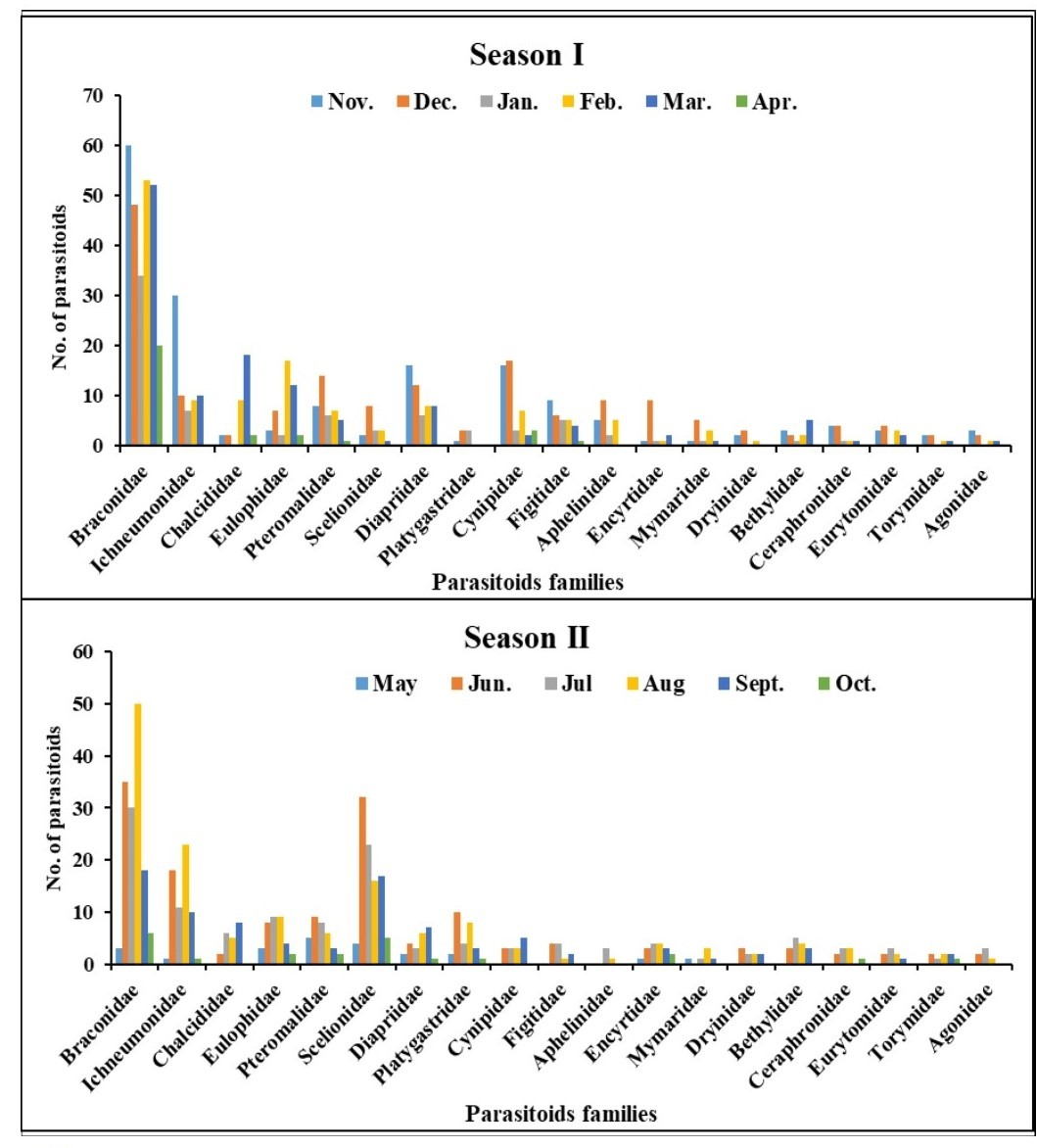Consequently, this research aims to evaluate the parasitism rate of parasites associated with BFSB throughout two seasons, which is crucial for the success of its biological control. Furthermore, we present a survey of Hymenoptera parasitoids families in the brinjal crop ecosystem in New Delhi.