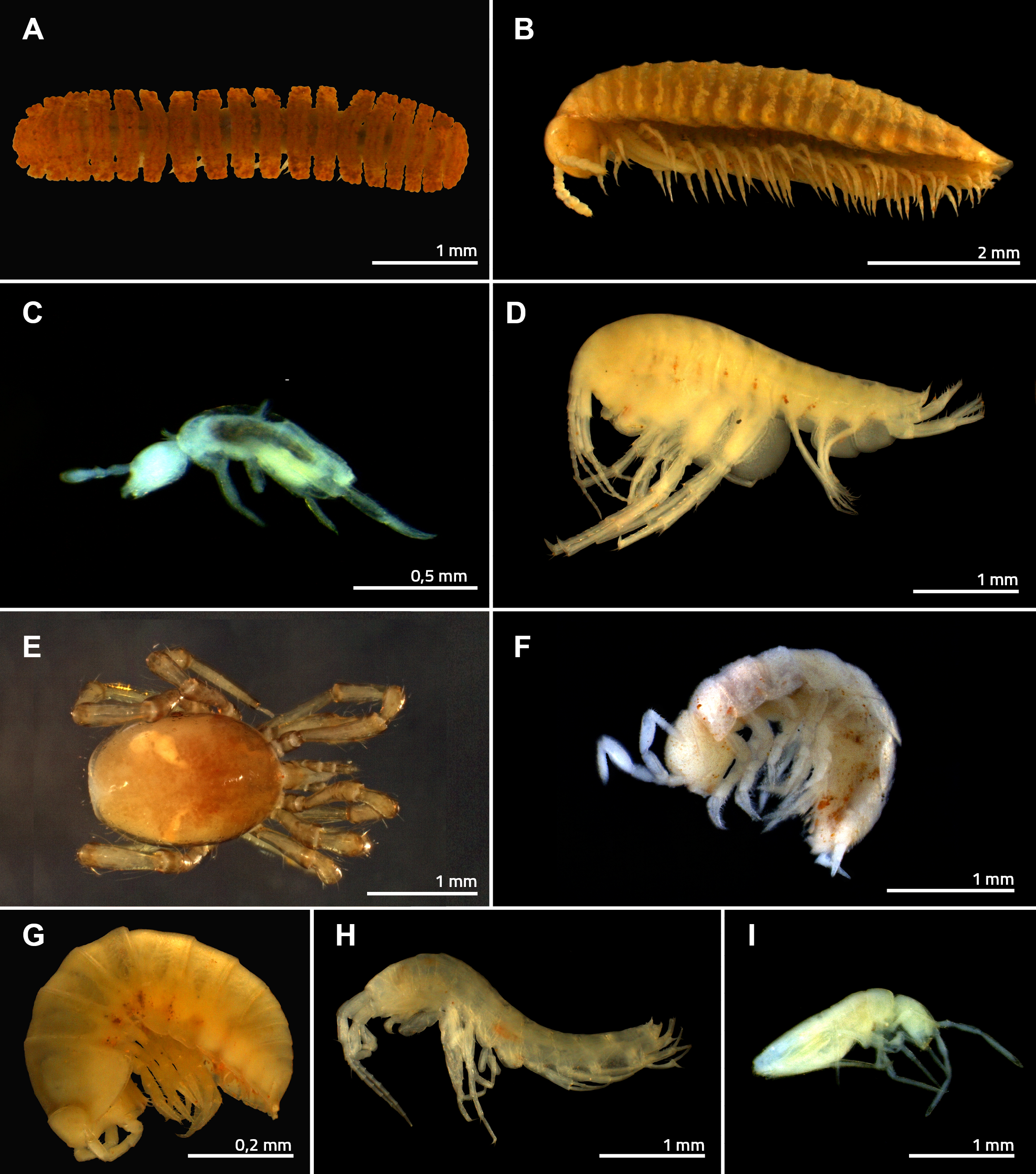A) Pyrgodesmidae gen.1 sp.2 (Polydesmida: Pyrgodesmidae). B) Glomeridesmus sp.1 (Glomeridesmida: Glomeridesmidae). C) Pseudosinella sp.1 (Collembola: Lepidocyrtidae). D) Hyalella sp.2 (Amphipoda: Hyalellidae). E) Laelapidae sp.1 (Mesostigmata: Laelapidae). F) Trichorhina sp.1 (Isopoda: Platyarthridae). G) Circoniscus carajasensis (Isopoda: Scleropactidae). H) cf. Bogidiella sp.1 (Amphipoda: Bogidiellidae). I) Trogolaphysa sp.2 (Collembola: Entomobryidae).