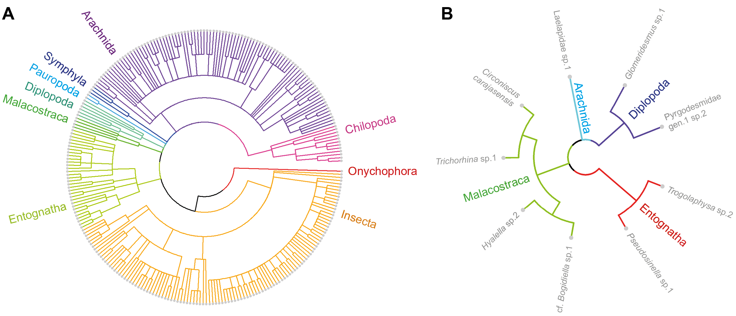 A) Considering all the cave Community (represented by 411 taxa identified at least at generic level, widely distributed in the study area). B) Only troglobites. Species groupings at class level are highlighted in the clusters.