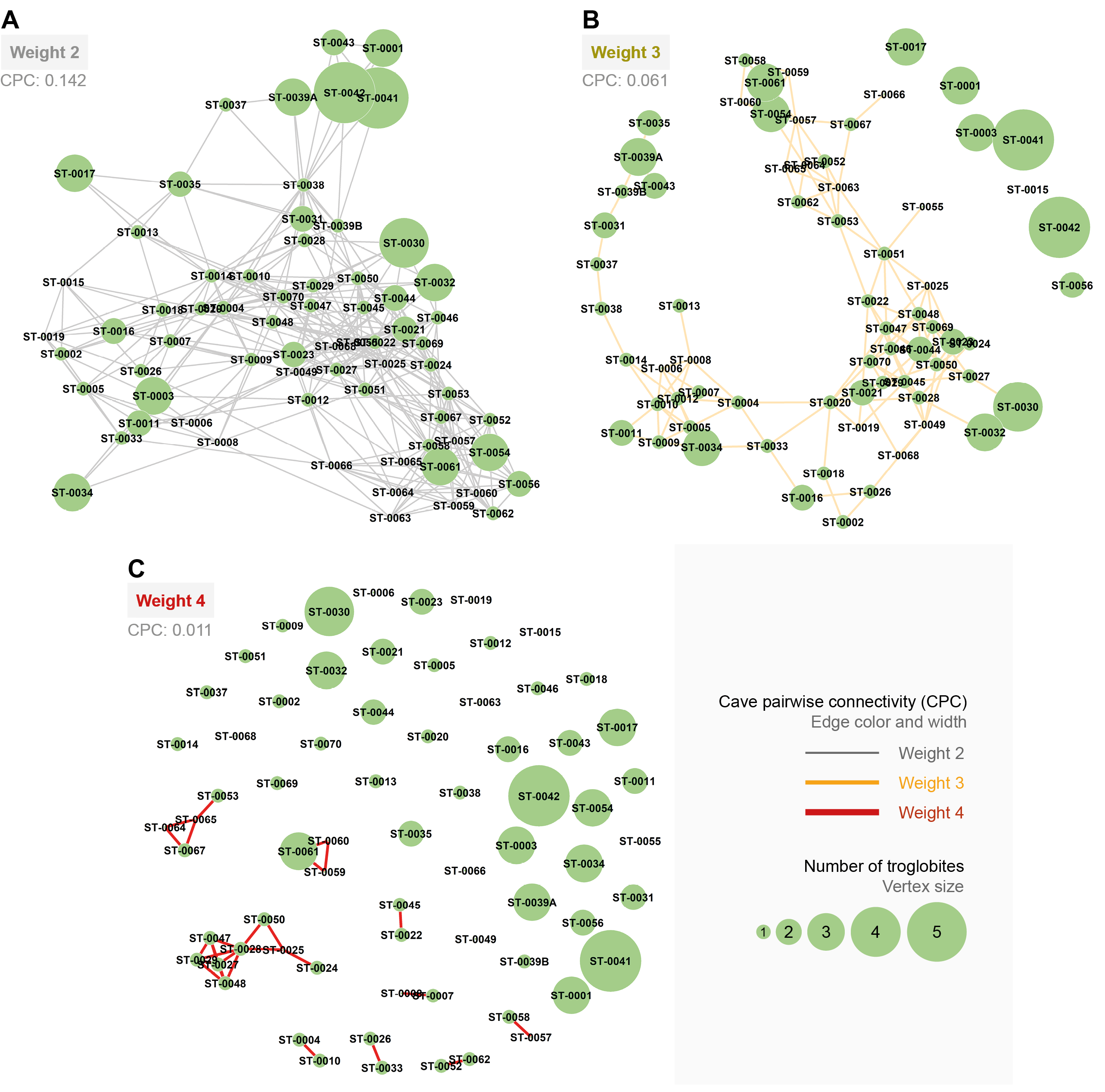A) Weight 2 (gray), B) Weight 3 (yellow), and C) Weight 4 (red). The vertex size expresses the number of troglobitic species sampled in the cavity.