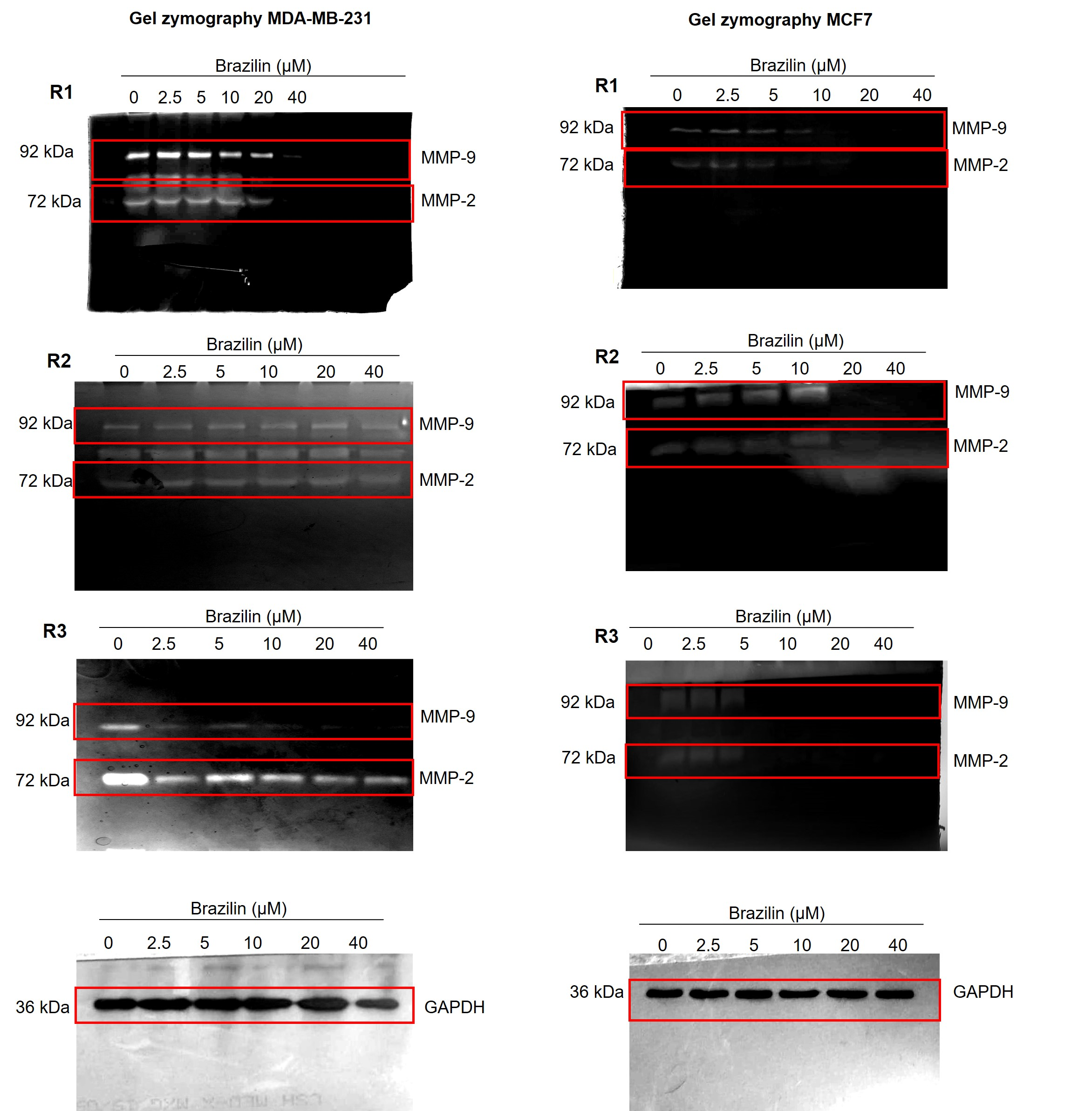 Independent replicates of the effect of Brazilin on MMP-2 and MMP-9 secretion in MDA-MB-231 and MCF7 cells.