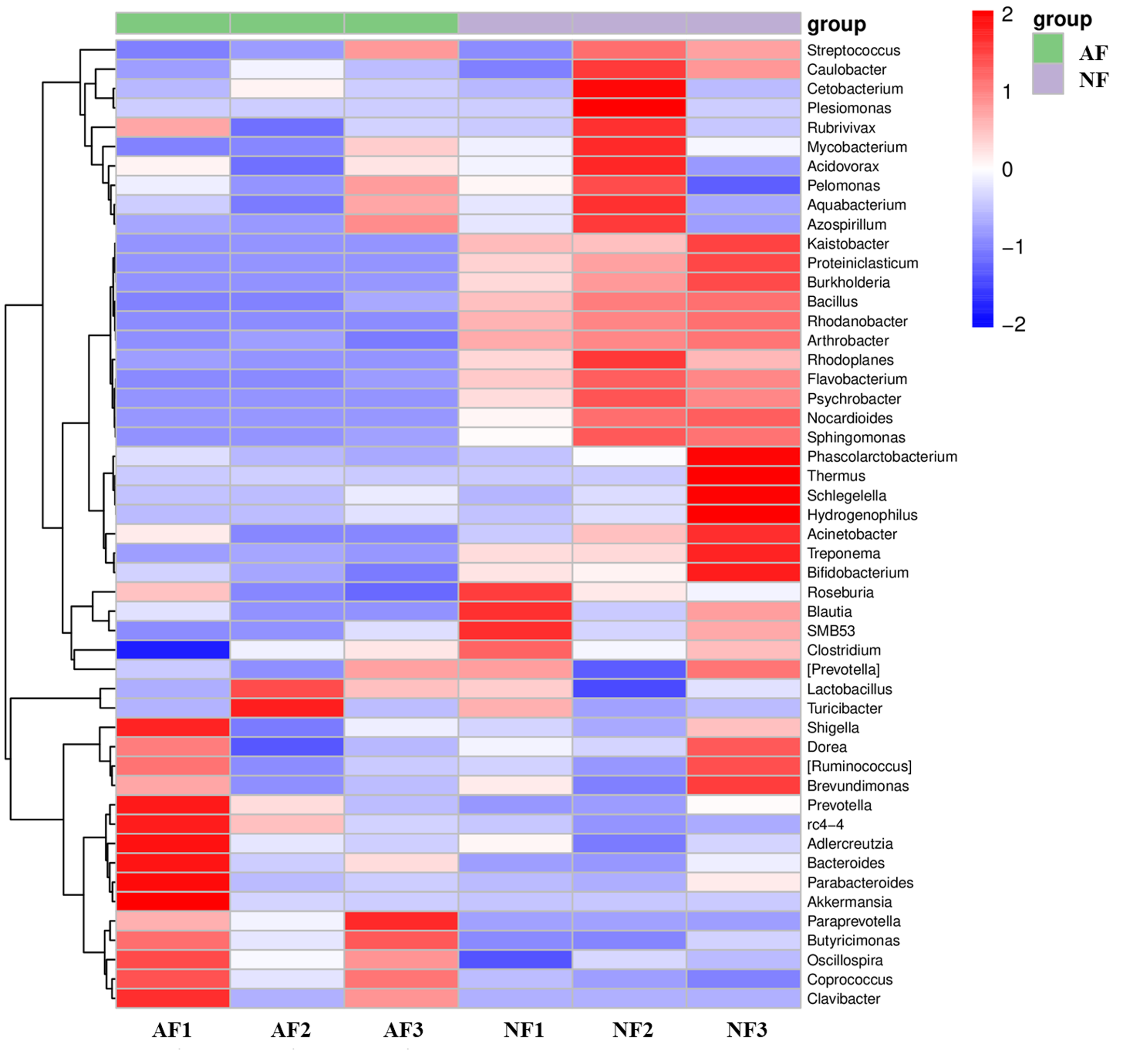 The rank abundance curve, which shows the distribution of OTU abundance in each sample by ranking the values. The results of the rank abundance curve showed that the NF group had higher abundance than the AF group (Fig. 2A). The differentially observed OTUs in mandarin fish between the two treatments were identified using a Venn diagram (Fig. 2B). A total of 772 OTUs were shared between the two treatments, and a total of 7,375 OTUs and 3,076 OTUs were uniquely identified in the NF and AF treatments, respectively. PCoA of beta diversity was performed to visualize the similarities between the two treatments with unweighted_unifrac and weighted_unifrac distances (n = 3, Figs. 2C, 2D). Both PCoA diagrams showed that samples from the AF group indicated a separation from the NF group, as the microbial communities appeared as two distinct central clusters along with the PCA distance variations on both axes. To provide a clearer visualization of the taxonomic abundance distribution between the two treatments, a heatmap clustering analysis was performed on the 50 most abundant genera, as shown in Fig. S2.