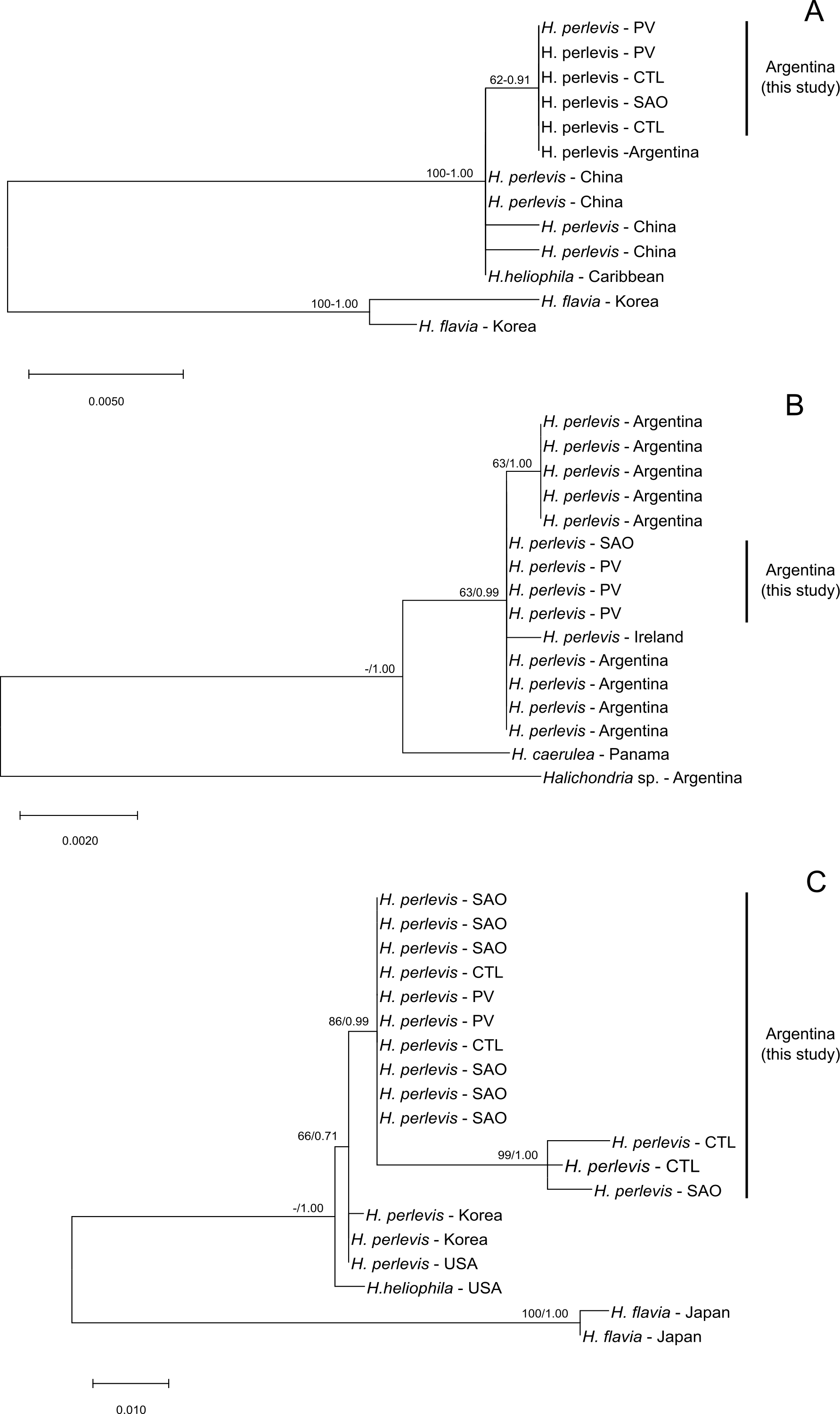 Relationships were recovered using CO1 (A), 18S (B), and ITS2 (C) sequences. Phylogenetic reconstructions recovered through the Maximum Likelihood (ML) and Bayesian methods. Numbers at nodes are Bootstrap support values (ten and thirty thousand, respectively). Hymeniacidon sinapium is presented as H. perlevis following Turner 2020 (see Table S2 for sequences references).