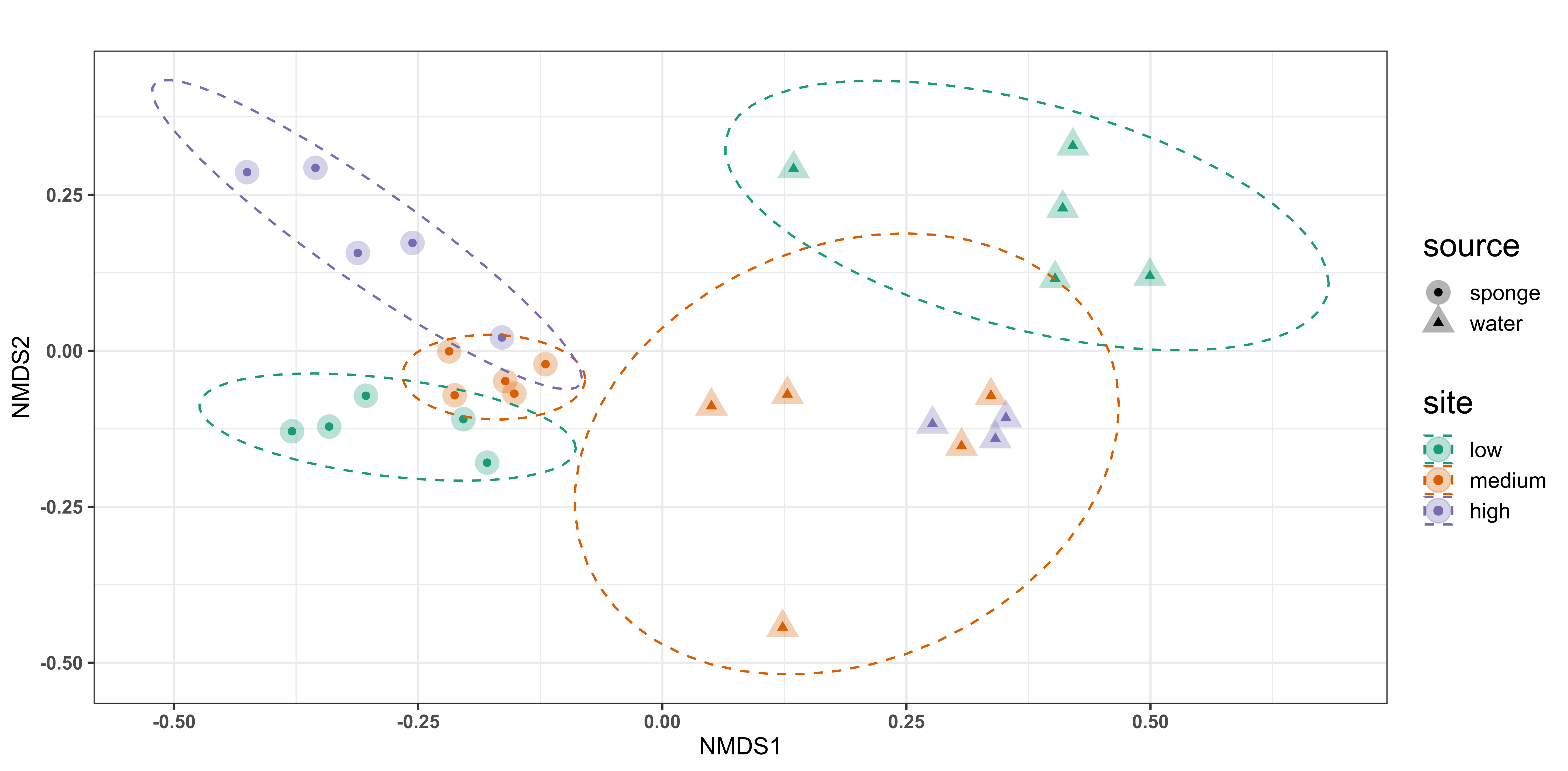 nMDS ordination plot of Hymeniacidon perlevis and water microbial assemblages based on Jaccard dissimilarity.