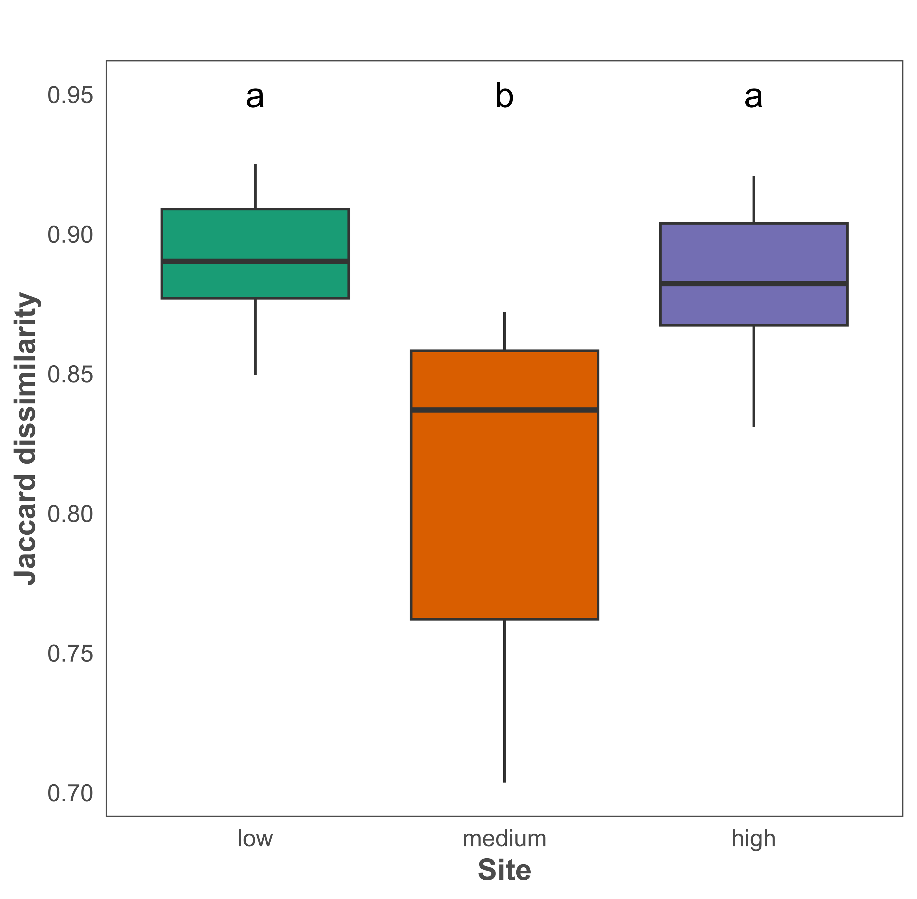(A) Observed richness and (B) Simpson evenness. Low, medium, and high represent sites with different levels of pollution (see Table S1). Lower-case letters indicate significant differences between sources and sites (Tukey’s post hoc test). Black dots and lines represent means and standard deviation, respectively.Taxonomic -diversity