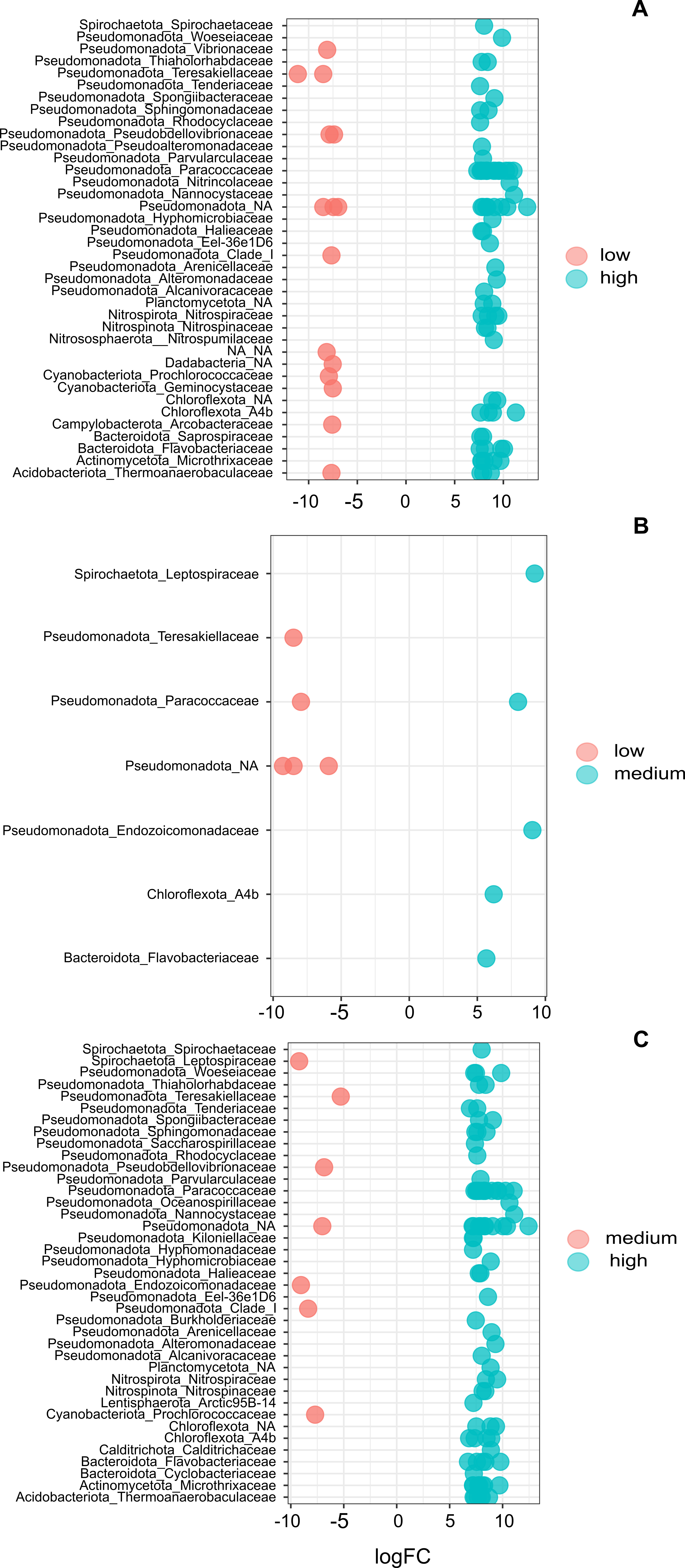 A) Microbes of sponges from sites with low- and high-pollution, B) with low- and medium-pollution, and C) with high- and medium-pollution.