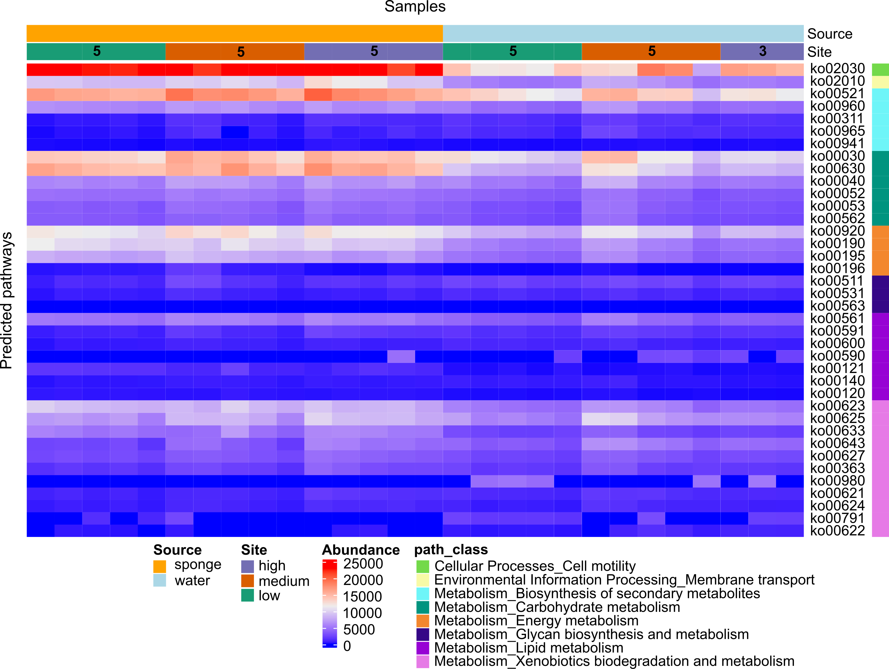 Heatmap showing differentially enriched KEGG pathways among Hymeniacidon perlevis and water samples.