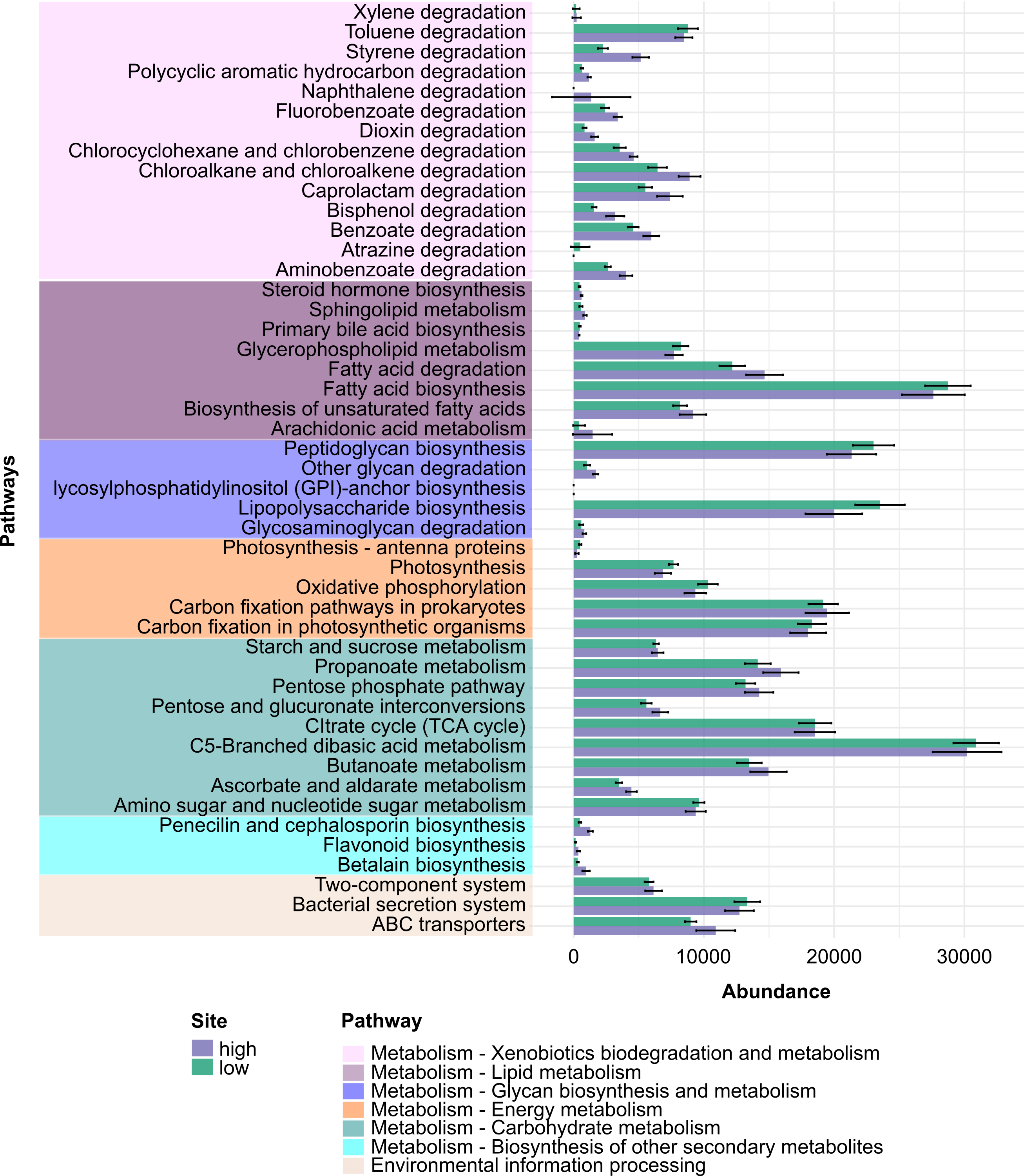 Bar plot of the differentially enriched KEGG pathways in Hymeniacidon perlevis from the sites with contrasting pollution histories.