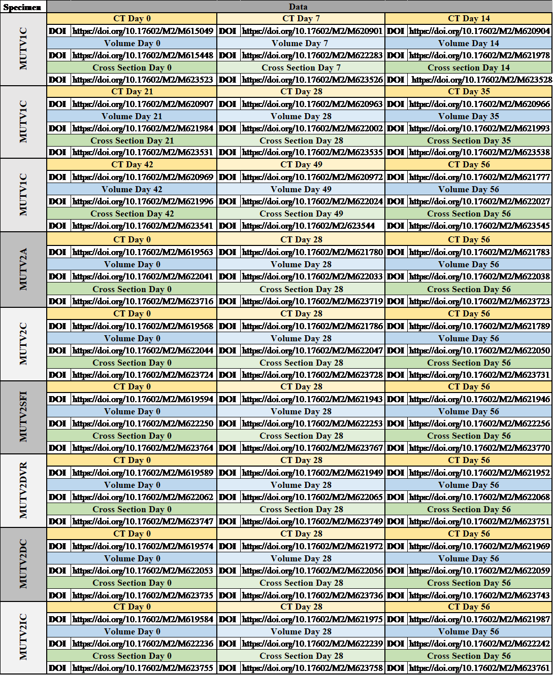 Morphosource project “Experimental Assessment of Diffusible Iodine-Based Contrast-Enhanced Computed Tomography (DiceCT) Protocols Datasets” DOIs for all CT, volumetric and cross section data across the seven specimens MUTV1C, MUTV2A, MUTV2C, MUTV2SFI, MUTV2DVR, MUTV2DC and MUTV2IC.