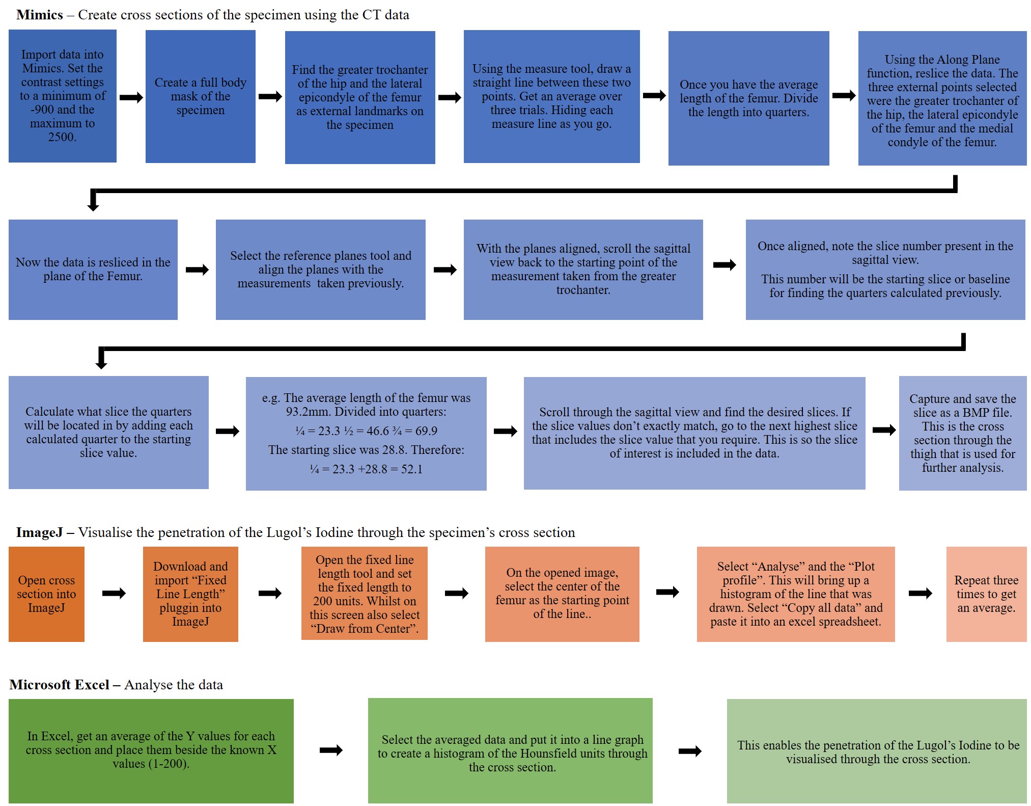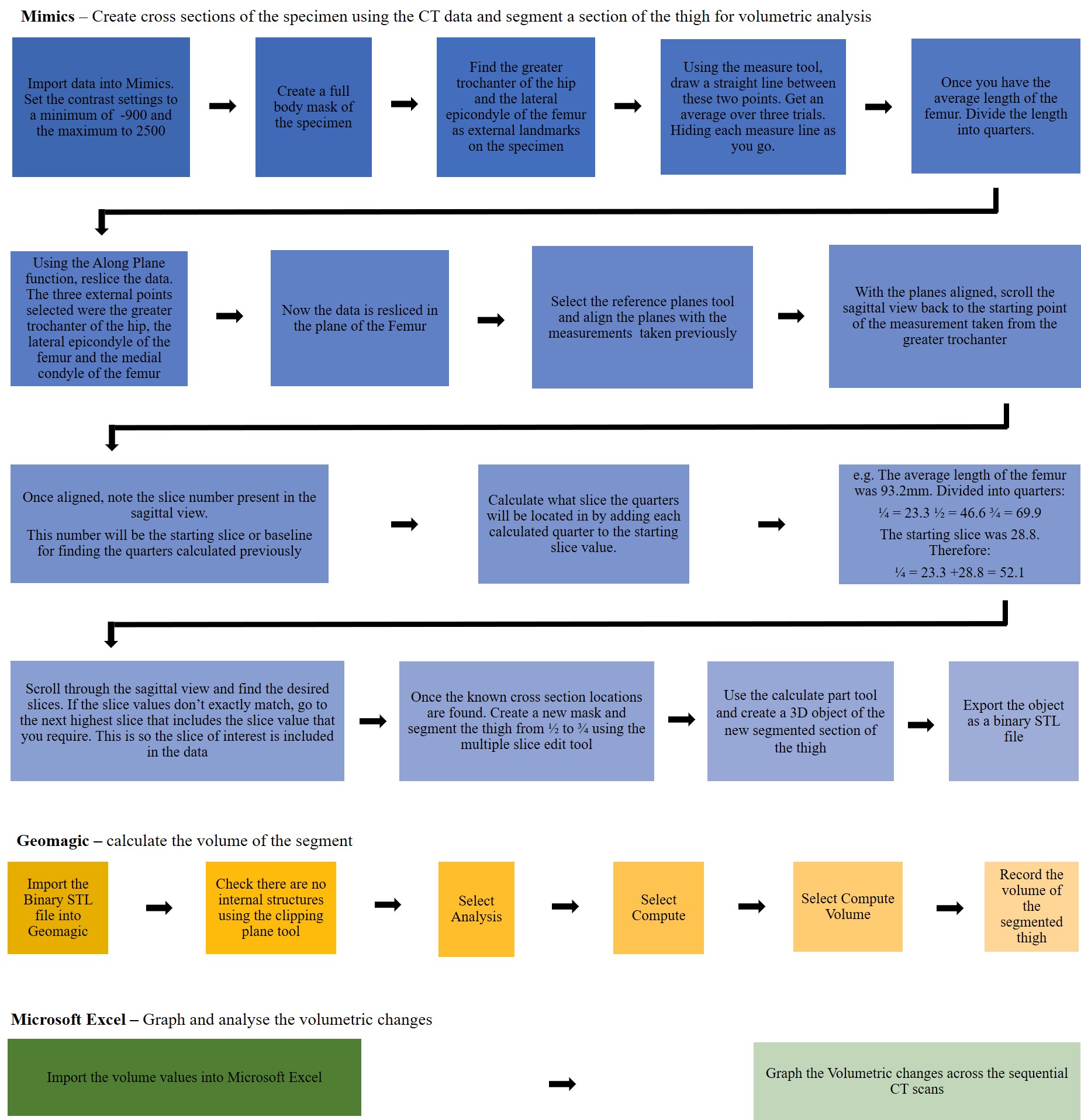 The steps of quantifying the data obtained from CT scans using three programs; Materialise Mimics, ImageJ and Microsoft Excel.