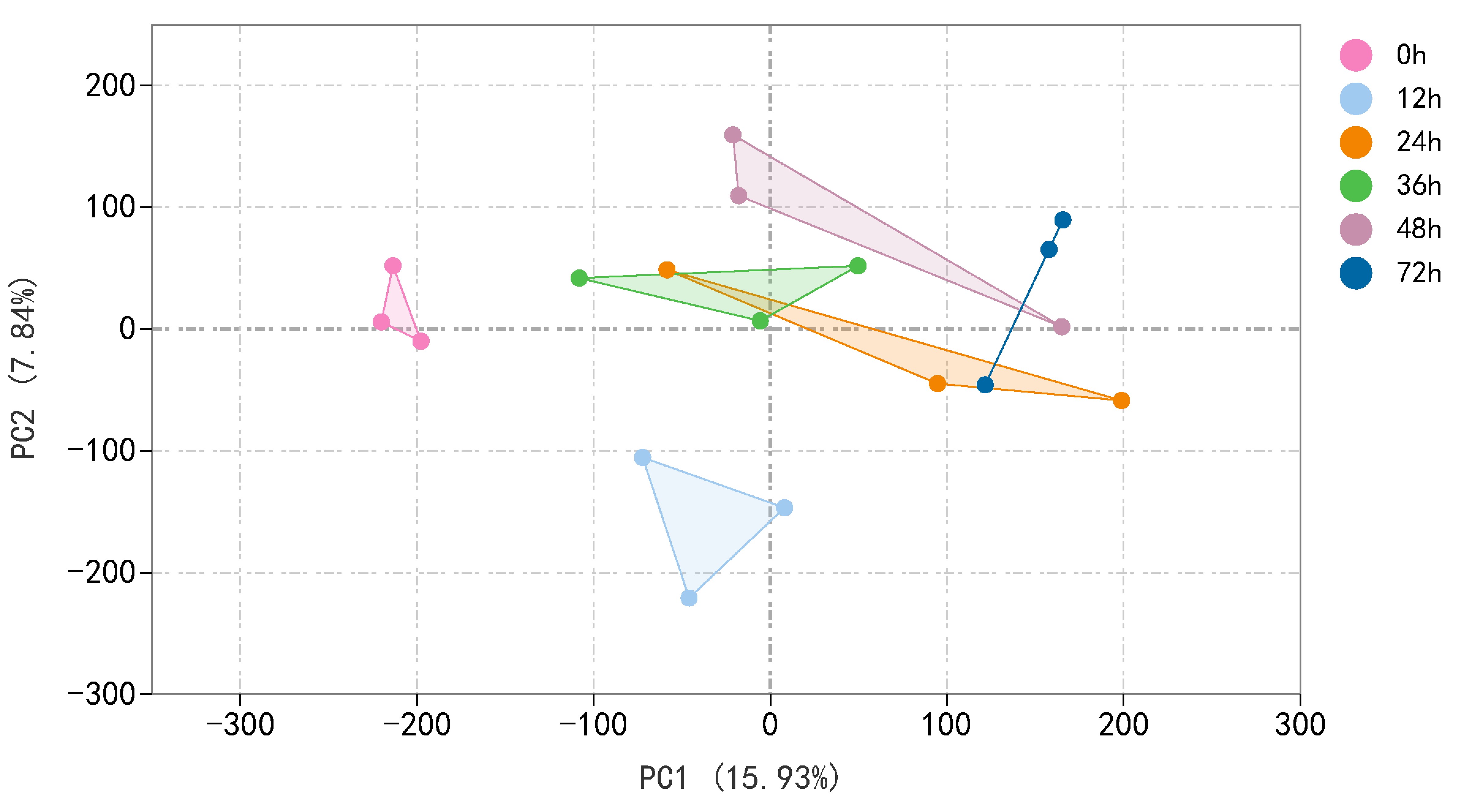 PCA plots of transcripts identified by RNA-seq of walnut husk attacked by C. pomonella at 0, 12, 24,36,48 and 72 h post-infestation. The values are FPKM.