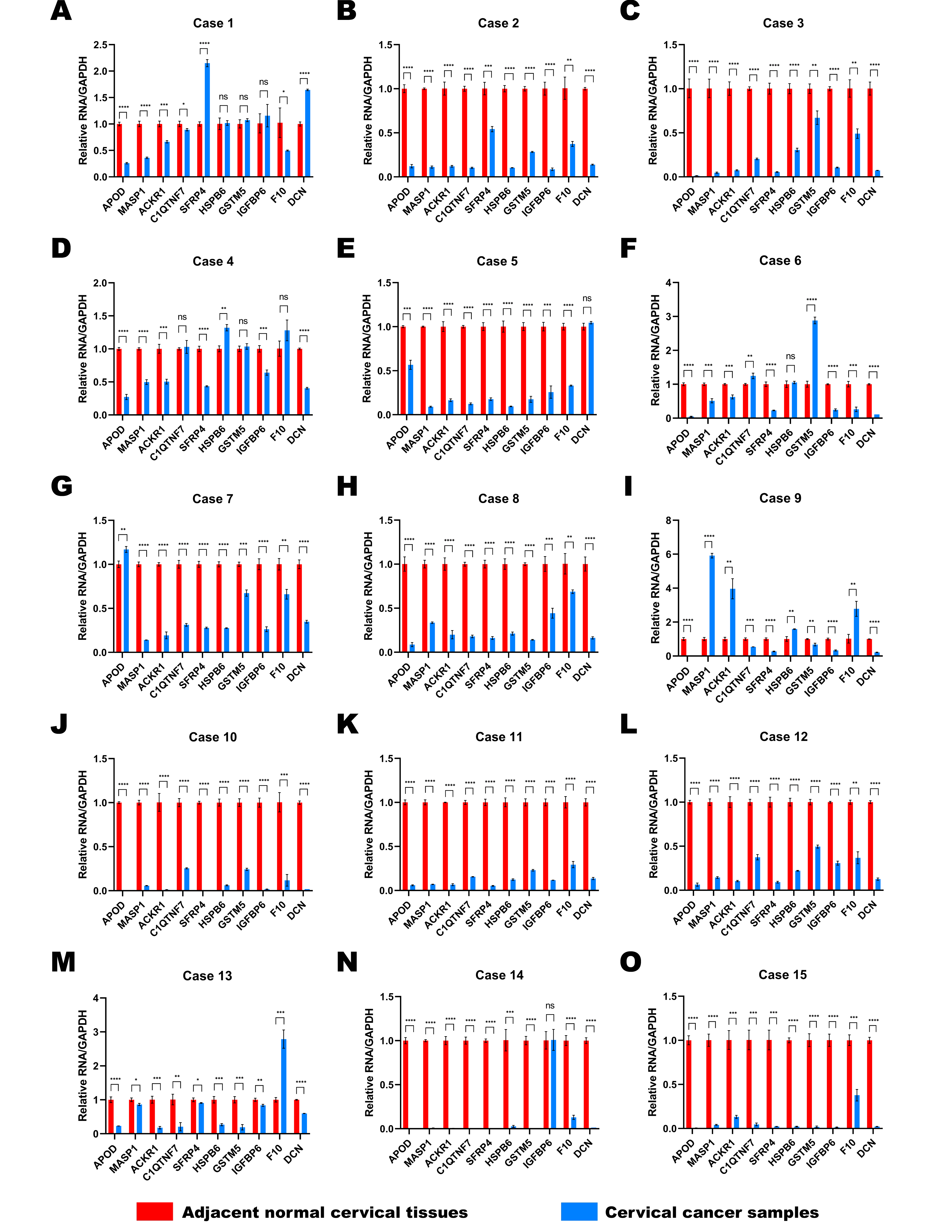 Fifteen pairs of cervical cancer tissues and adjacent normal cervical tissues were collected after the radical hysterectomy, and their brief clinical information were shown in Table 2. We performed RT-qPCR to determine the expressions of 10 selected DEGs in various patients (Figs. 6A–6J). GAPDH was used as the normalization gene. Similar to the analysis results of public database, the expression levels of most DEGs were down-regulated in cervical cancer tissues compared to the paired normal cervical tissues (Figs. 6A–6J). In Cases 2, 3, 8, 10, 11, 12 and 15, the expression levels of all 10 selected DEGs decreased significantly in cervical cancer tissues (Figs. S1B, S1C, S1H, S1J, S1K, S1L, S1O). The expression of DCN was almost unchanged in Case 5 (Fig. S1E), and IGFBP6 expression remained stable in both normal and cancer tissues of Case 14 (Fig. S1N). However, the expression levels of other DEGs in Case 5 and 14 were lower in cancer tissues than that in normal tissues (Figs. S1E and S1N). All data in Fig. 6 and S1 showed that the expression levels of APOD, MASP1, ACKR1 and SFRP4 were extremely consistent in most cases, demonstrating that they have a potential to be biomarkers for cervical cancer diagnosis.