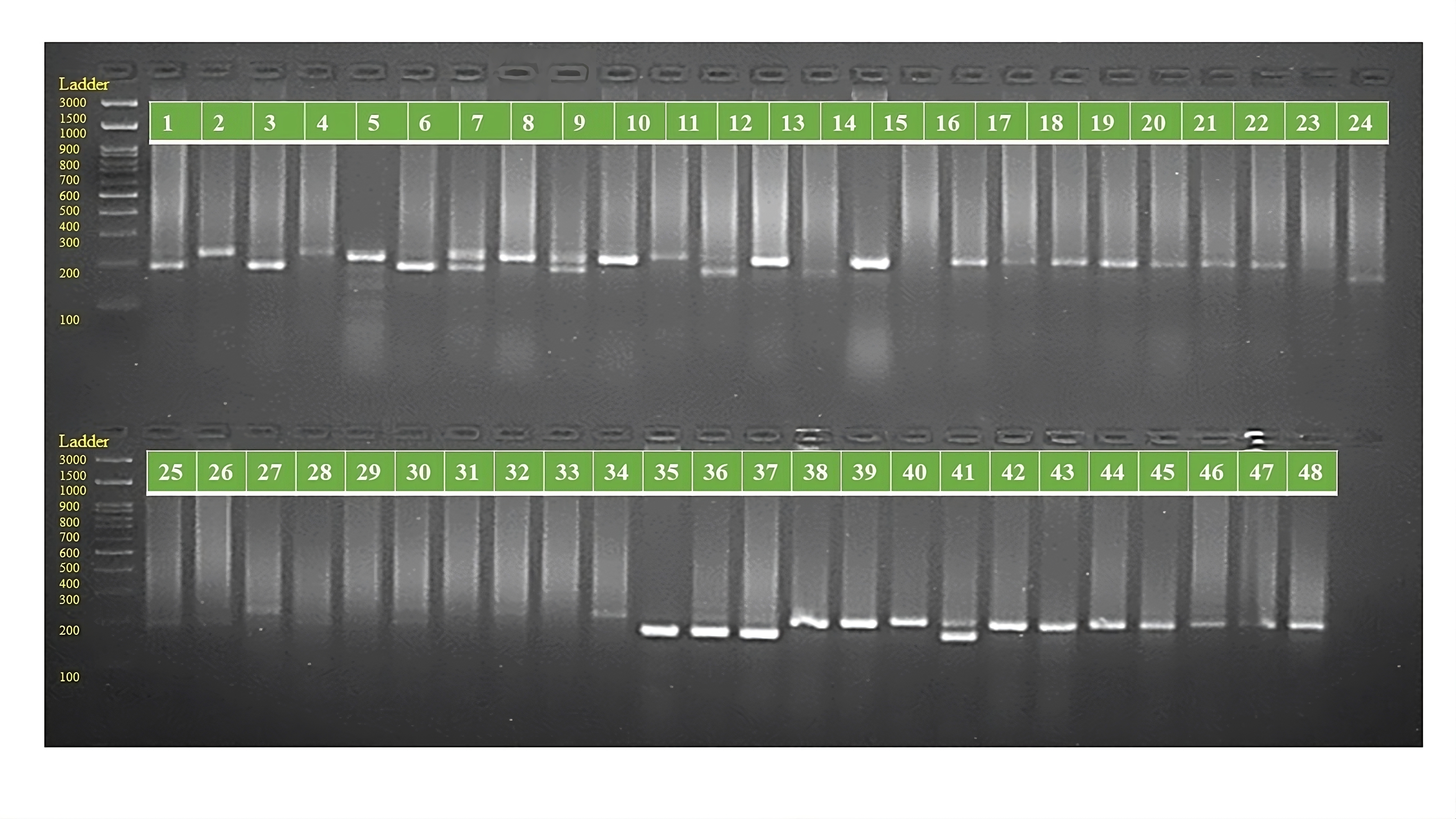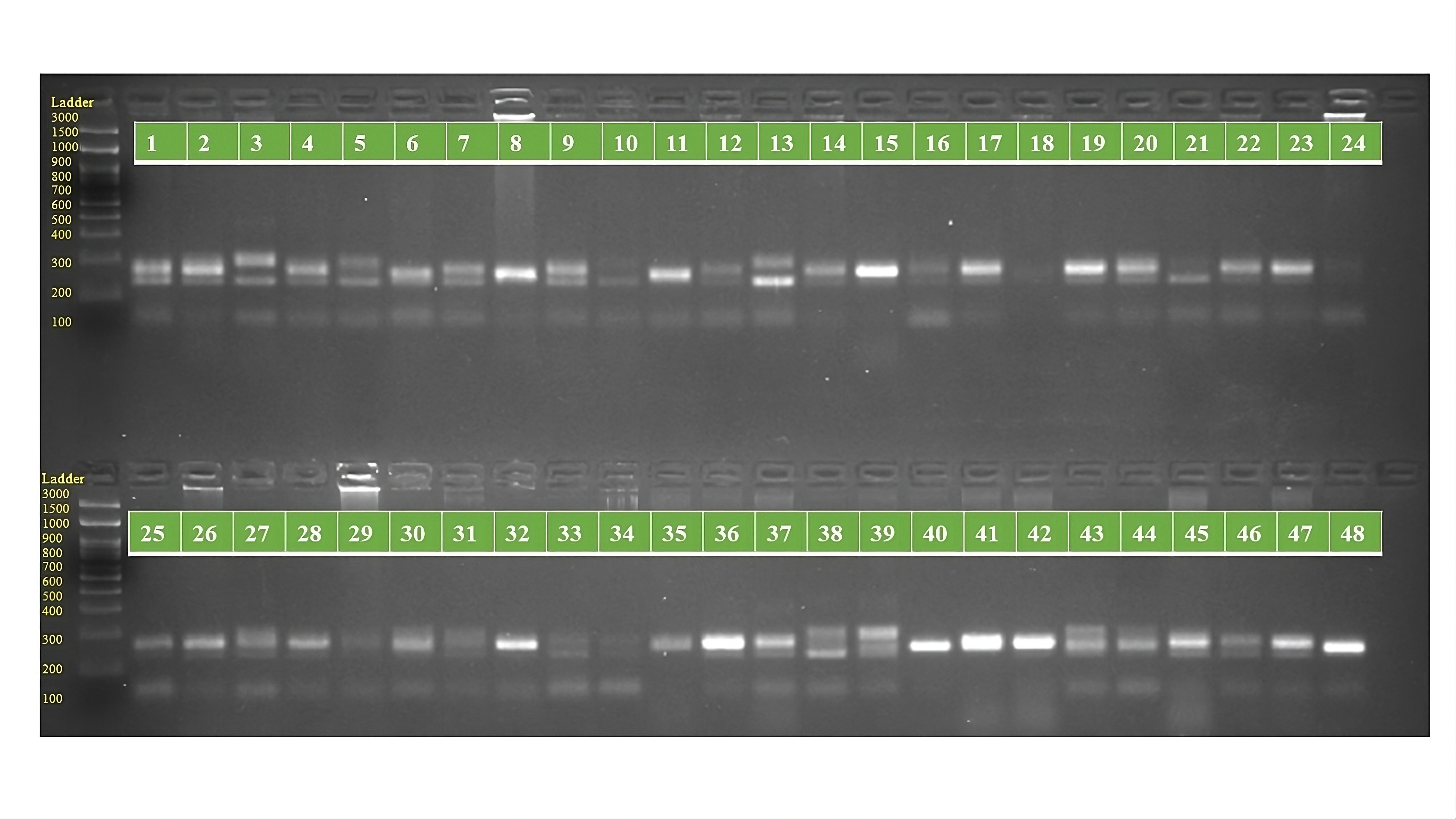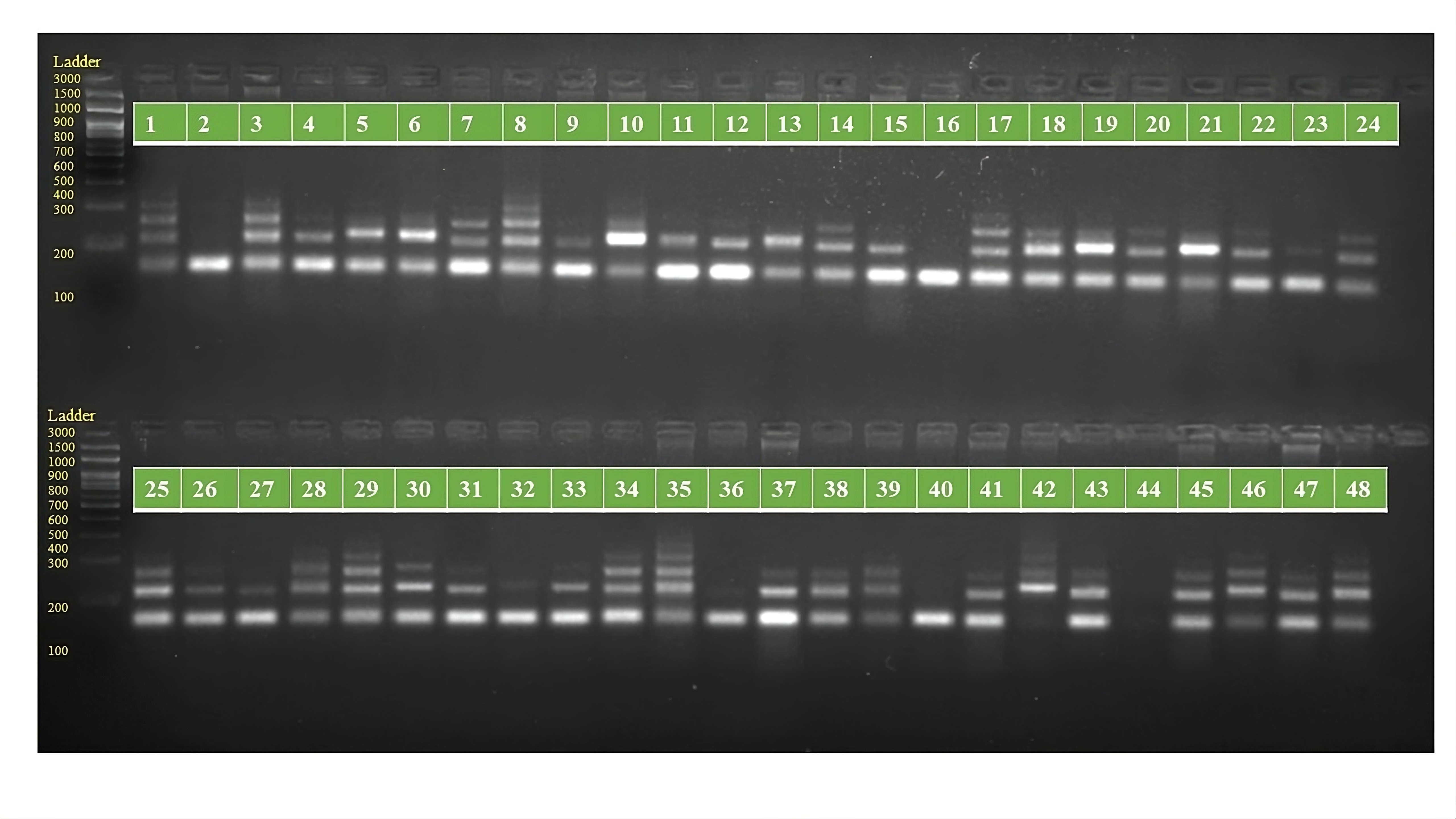 The genotypes are labeled as follows: 1. ARM 248B, 2. COSF 6B ©, 3. GMU 1181, 4. RHA 102, 5. CMS 1103B, 6. GMU 780, 7. CMS 335B, 8. RCR 72, 9. CMSNDCMS2B, 10. GMU 344, 11. CSFI 99 ©, 12. RHA 272-1, 13. GMU 336, 14. RHA GPR 58, 15. CMS 911B, 16. GMU 477, 17. GMU 450, 18. PM 95, 19. GMU 428, 20. GMU 411, 21. GMU 741, 22. CMS 108B, 23. COSFV ©5, 24. GMU 734, 25. ARM 240B, 26. CMS 597B, 27. HOCL 6R, 28. RHA GPR 110, 29. IB 80, 30. CMS 107B, 31. PM 36, 32. IL 77, 33. RHA95-C-10, 34. IL84, 35. RHA 278, 36. RHA 273, 37. RHA 857, 38. GMU 755, 39. PM 53, 40. GP6 912, 41. CMS 135B, 42. REC 431, 43. GMU 325, 44. GP6 1089, 45. RHA 378, 46. PM 65, 47. RHA GMU 755 and 48. COSF 13B.Figure 2: PCR amplification profiles of SSR marker ORS 1271 for 48 sunflower genotypes.