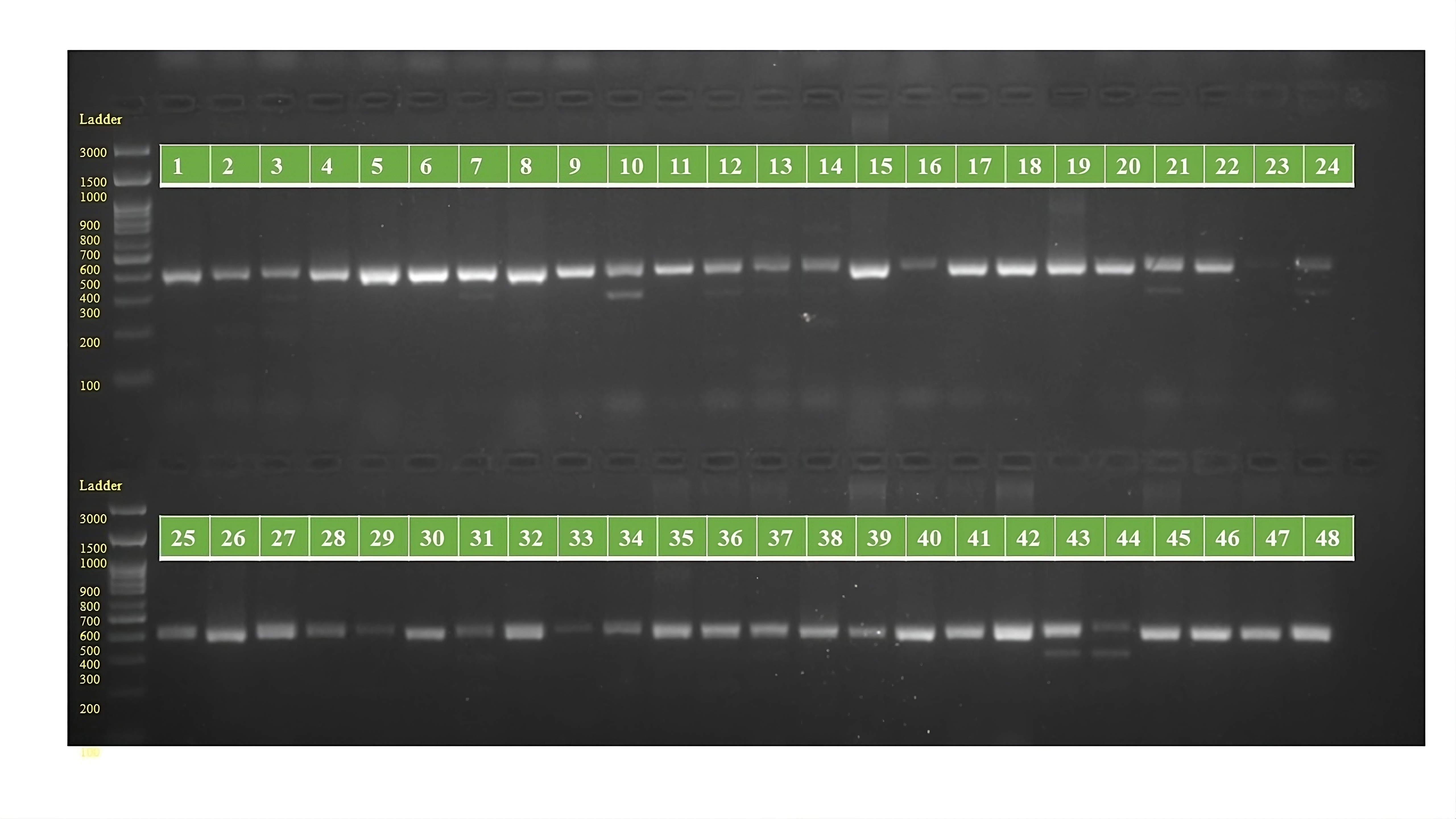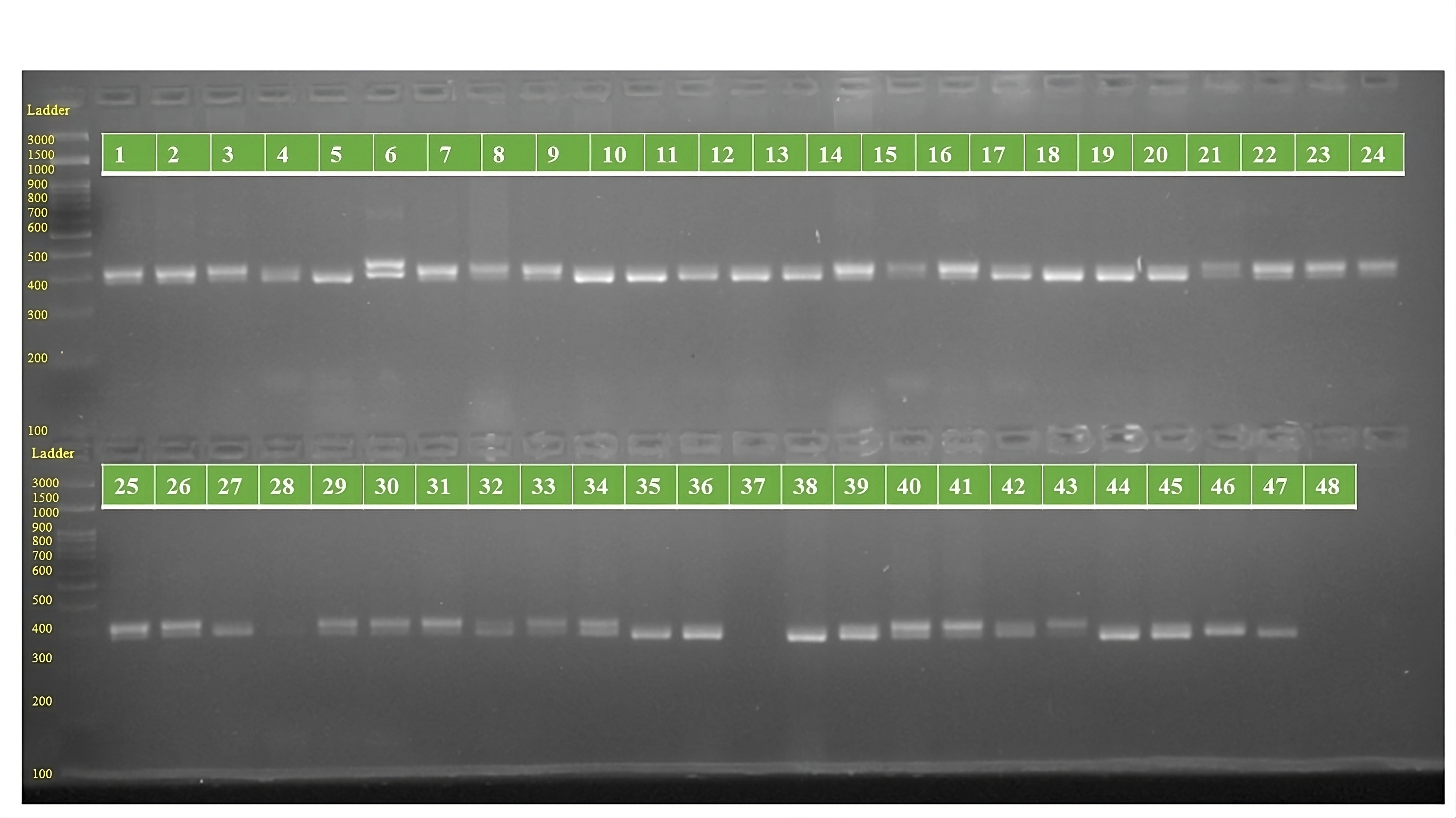 For polymerase chain reaction (PCR), the reaction mixtures consisted of 2 µL of DNA, 3 µL of Master Mix (2X), 1 µL of 10 pMol primer, and 4 µL of nuclease-free water. PCR amplification was performed in a thermocycler (Applied Biosystems, Waltham, MA, USA) with the following conditions: an initial cycle at 94 °C for 3 min (denaturation), followed by a touch-down phase with the annealing temperature decreasing by 0.5 °C per cycle for 20 cycles (94 °C for 30 s, 63 °C for 30 s, 72 °C for 1 min). This was followed by 20 cycles of 94 °C for 15 s, 55 °C for 30 s, and 72 °C for 1 min, concluding with a final extension step at 72 °C for 10 min. The PCR products obtained were run on a 3% agarose gel and observed using the GELSTAIN 49 advanced gel documentation unit (M/s Medicare, India). The molecular weight of the amplified bands was determined by comparing them with a 100 base pair ladder.