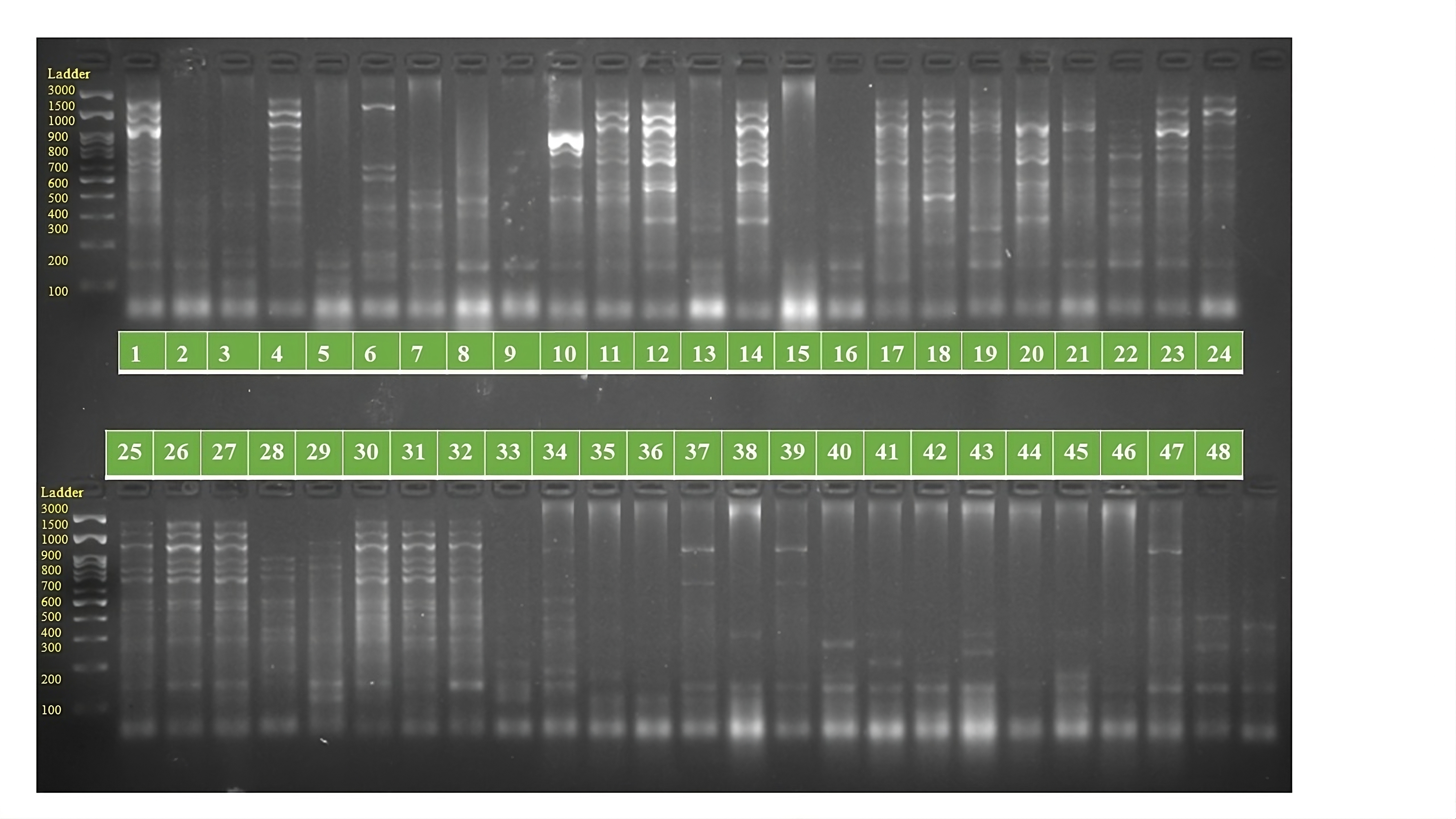 The initial assessment screened 130 SSR primers chosen from literature review. Out of these, 103 primers demonstrated efficient traits like robust amplification, reproducible patterns, and multiple polymorphic fragments per assay, while the rest were monomorphic. Detailed outcomes including polymorphism percentages, polymorphism information content (PIC), resolving power (Rp), and marker index (MI) are provided in the accompanying Table S2. The screened primers produced well-defined amplified bands, with allele counts ranging from 2 to 6 per individual across all loci. A total of 267 alleles were identified, averaging 2.6 alleles per locus, with ORS621 showing the highest count at 6 alleles. All alleles exhibited polymorphism, resulting in a 100% polymorphism percentage, a notable finding in this study. PCR amplification of SSR markers for 48 sunflower genotypes are shown in Figs. S1–S6 and Figs. 1–2. The average PIC value among all primers ranged from 0.08 to 0.49 in this survey. Primer ORS853 exhibited the minimum average PIC value, whereas primer ORS613 displayed the maximum. Primer Index values fluctuated from 0.16 to 1.94, with ORS725 having the highest and ORS853 the lowest values. Resolving Power (Rp) values varied from 0.17 to 5.67, with the highest observed in ORS887 and the lowest in ORS1120. The mean Rp values ranged from 0.08 to 1.77, with ORS565 having the highest and ORS1120 the lowest. The average PIC was calculated to be 0.30, while the Multiplex Ratio (MR), Effective Multiplex Ratio (EMR), and Marker Index (MI) were determined to be 2.59, 2.59, and 0.78, respectively.