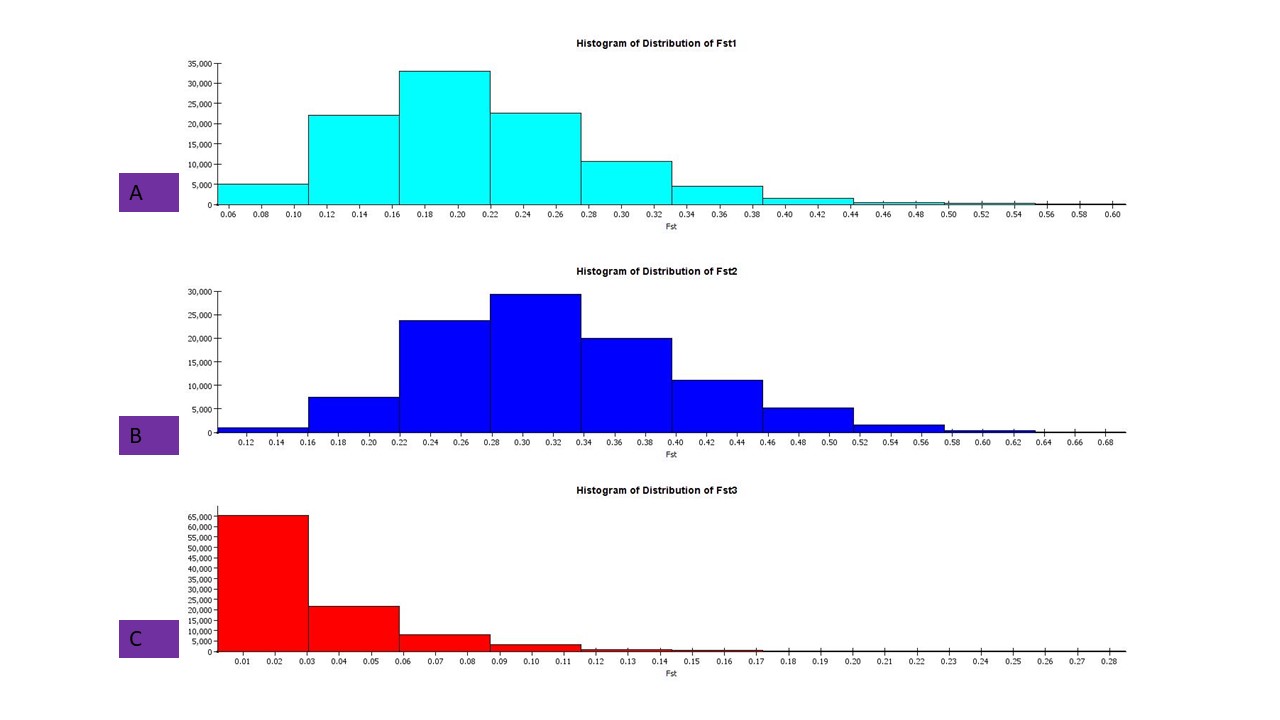 (A) Histogram distribution of Fst1, (B) Histogram distribution of Fst2 and (C) Histogram distribution of Fst3