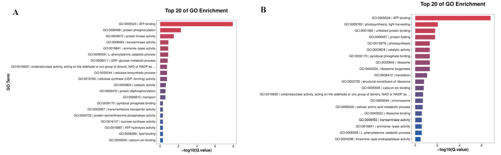 Figure 4: Significantly enriched GO terms in cultivars H105 (A) and H28 (B).