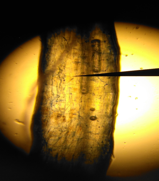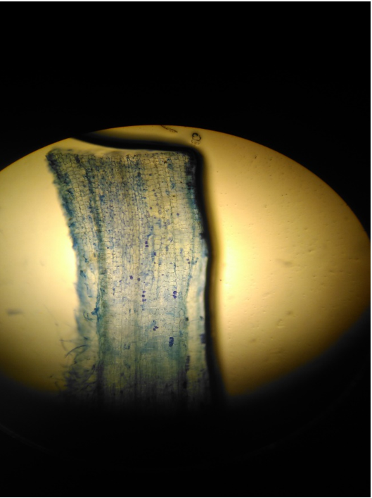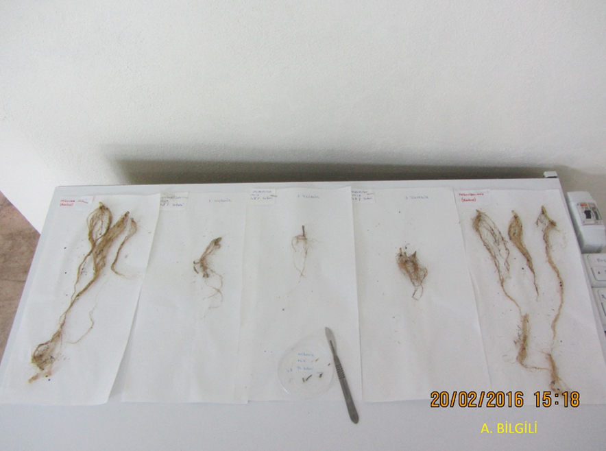 By staining the roots with Trypan Blue, we examined the percentage colonization and the number of mycorrhizal spores in the roots of the pots treated with mycorrhiza under a microscope (Read, Kouckeki & Hodgsen, 1976, Fig. 2). To assess the number of mycorrhizal roots colonized and the efficacy of AMFs, the roots were removed from the pots and washed with tap water after harvest. Subsequently, all roots were placed in capped tubes containing 50% ethyl alcohol, which were kept in the dark in a refrigerator. The roots were then taken out, washed with distilled water, and cut to approximately 5 cm in length from the bottom of the root collar. These sections were wrapped in gauze and sealed with a stapler. The samples were returned to the test tubes, and a 10% KOH solution was added, followed by incubation at 25 °C for 4 days. After the 4th day, the cloth packages were opened, and the roots were washed with distilled water. They were then rewrapped with the cloth packages and submerged in a 1% HCl solution for 3 min. Next, the samples were transferred to a 1% Trypan Blue solution and placed on a magnetic stirrer for 3 h at a mild heat. Finally, the samples were removed from the cloth packages, thoroughly washed with distilled water, and placed on a slide for further examination. The samples were then observed using a light microscope at a magnification of 40x (Koske & Gemma, 1989; Yildirim, 2014).