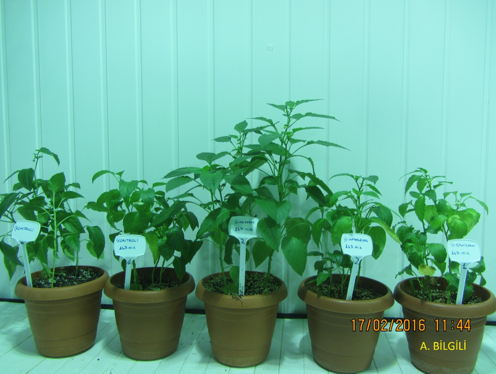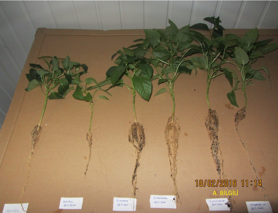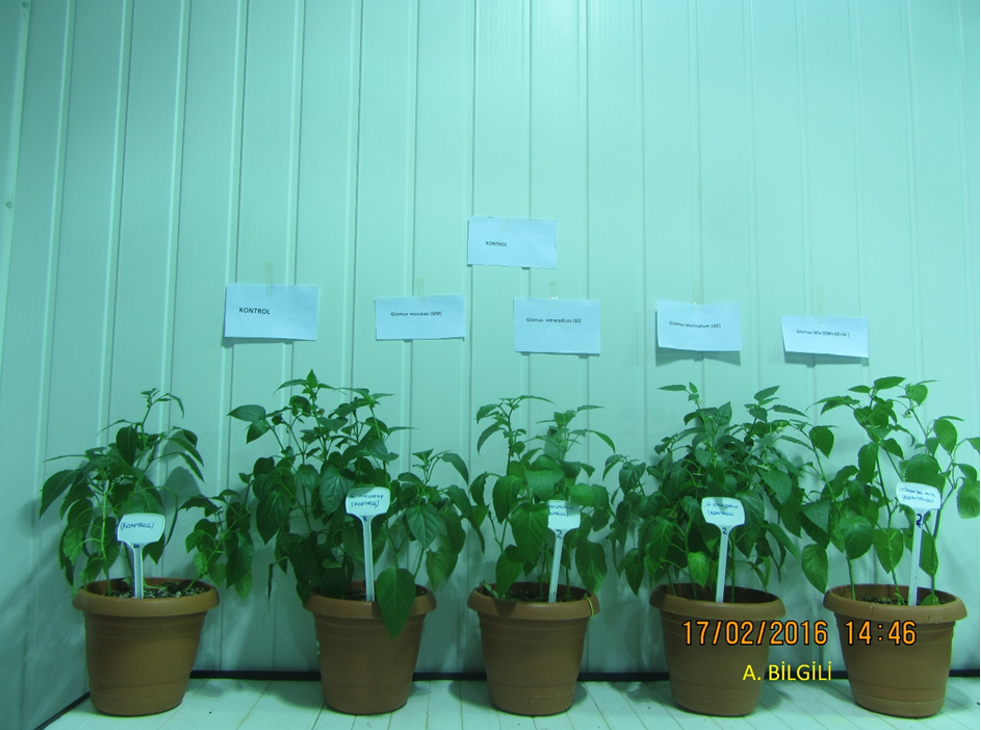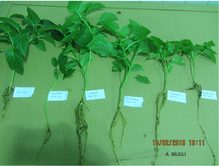The pepper variety INAN-3363 F1 (Capsicum annuum L.), registered by the GAP Agricultural Research Institute (GAPTAEM), was used as the plant material in this study. AMF used in the study; Claroideoglomus etunicatum (syn. Glomus etunicatum; Sensoy et al., 2007), Rhizophagus intraradices (syn. Glomus intraradices; Demir & Onoğur, 1999), and Funneliformis mosseae (syn. Glomus mosseae; Demir et al., 2015), were obtained from Dr. Semra Demir (Van-Yüzüncüyil University, Van, Turkey). The three species were combined in autoclaved sterile peat to create a mycorrhizal mix. The inoculum of the mycorrhizal mix was prepared in a ratio of CE/FM/RI (1:1:1) using sterile peat. The mycorrhizal fungus inoculum was applied at a rate of 1,000 spores/10 g of peat soil (Menge & Timmer, 1982).