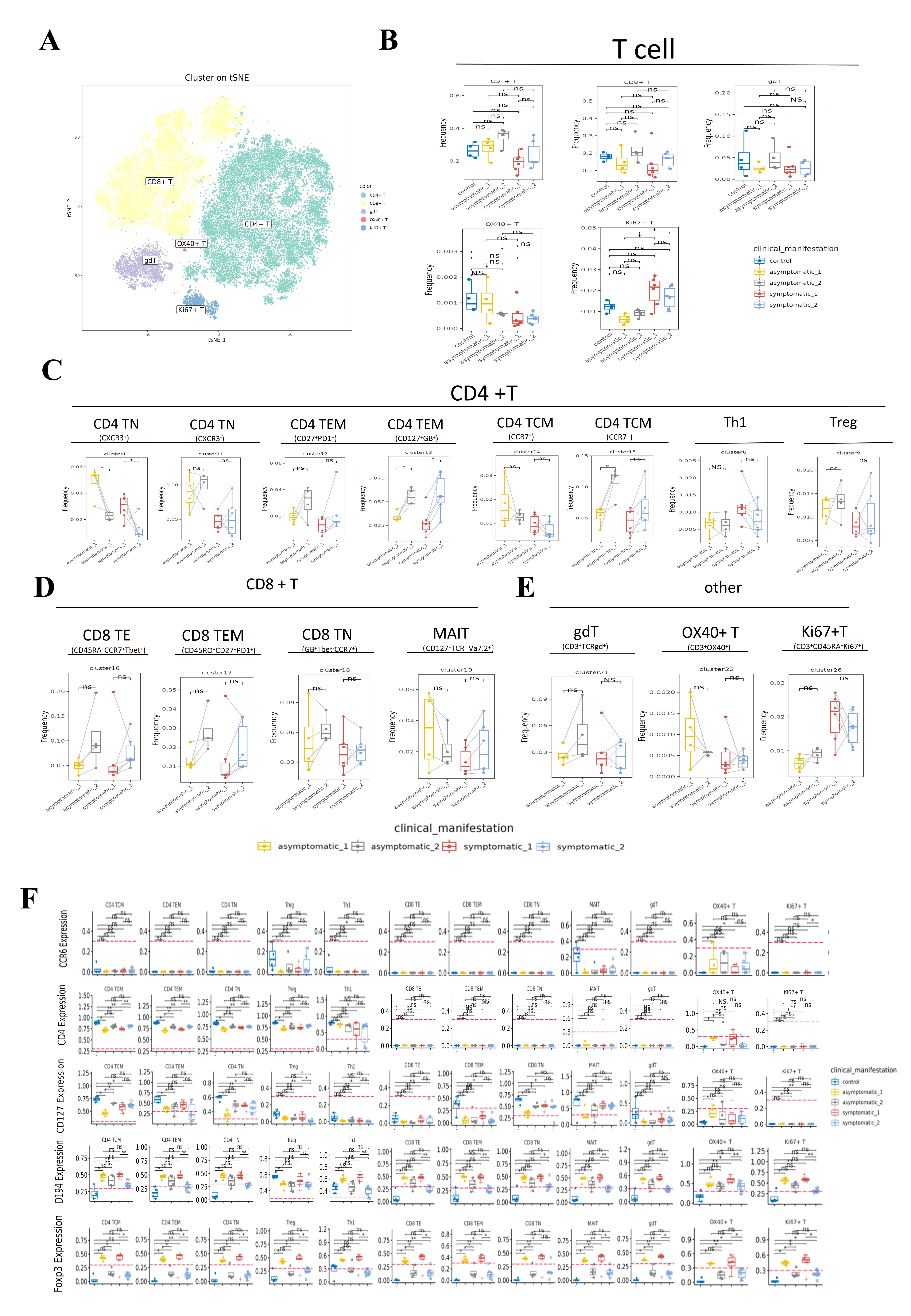 Human T cells are the main immune cells against viral infection and play an important role in viral clearance. In this study, fifteen T lymphocyte subsets were differentiated into five types of CD4+ T cells, CD8+T cells, gdT, OX40+ T cells and Ki67+T cell subsets according to the expression of typical lineage markers (Fig. S1C), and were mapped into t-SNE of all participants (Fig. 3A). Moreover, we analyzed the changes in major T-cell subsets in patients with different stages and clinical presentations and healthy controls (Fig. 3B).