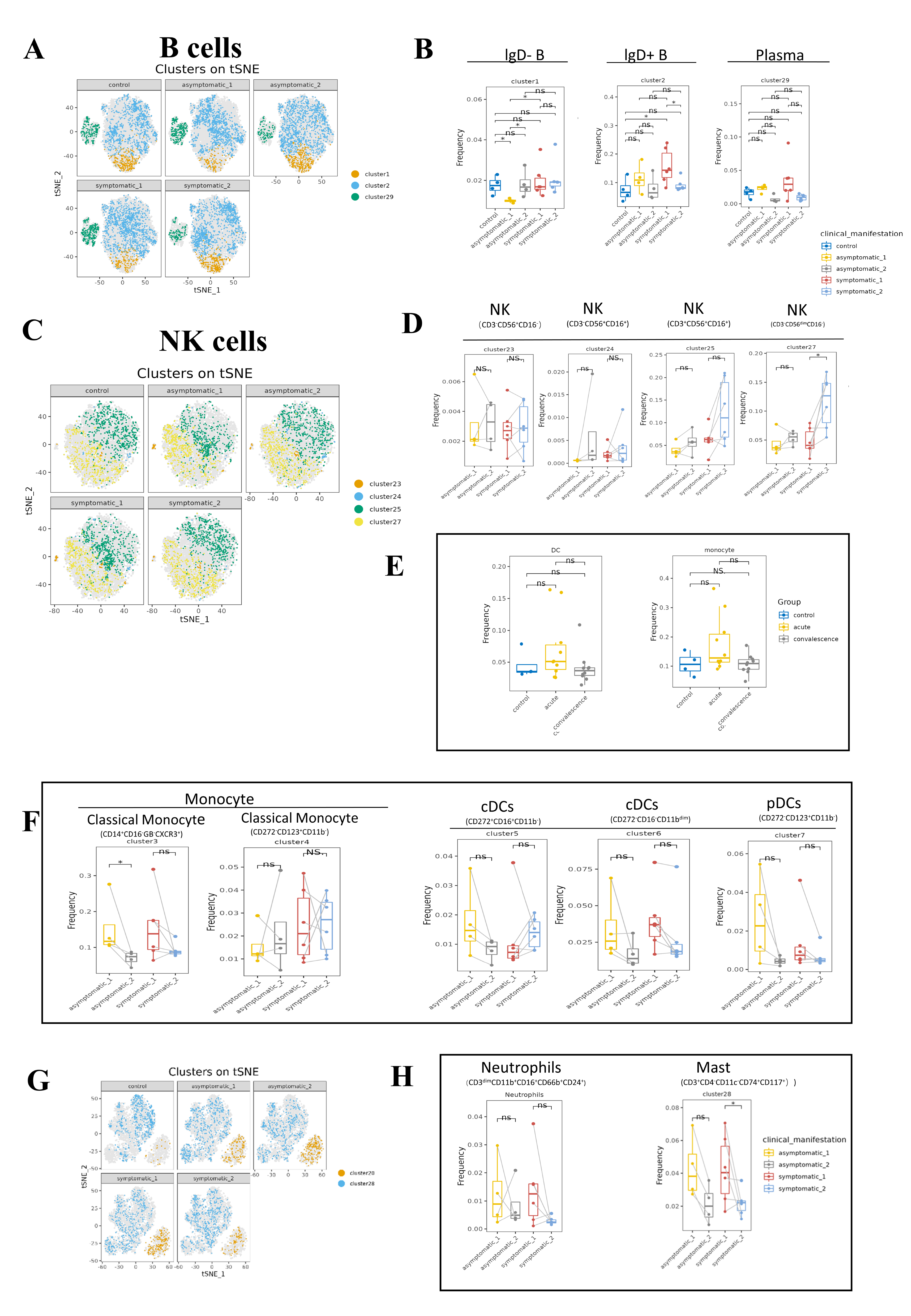 •(A) t-SNE plots showing the major B-cell populations in the acute (_1) and recovery (_2) phases of COVID-19 patients with different clinical manifestations and healthy controls. •(B) Boxplots reveal differences between symptomatic and asymptomatic COVID-19 patients and healthy controls for each B-cell subpopulation at different stages (ns p > 0.05, * p < 0.05). •(C) t-SNE plots of the distribution of all NK subpopulations in the acute and recovery phases in asymptomatic and asymptomatic COVID-19 patients and healthy controls. •(D) Boxplots revealing differences in each NK cell subpopulation in different groups (ns p > 0.05, * p < 0.05). •(E) Boxplots revealing the frequencies of all DC and monocyte subpopulations in different groups (ns p > 0.05, ** p < 0.01). •(F) Boxplots revealing differences in each monocyte and DC subpopulation between symptomatic and asymptomatic COVID-19 patients in the acute and convalescence phases and healthy controls (ns p > 0.05, * p < 0.05). •(G) t-SNE plots showing neutrophil and mast cell subpopulations in symptomatic and asymptomatic COVID-19 patients during the acute and convalescence phases and healthy controls. •(H) Boxplots revealing the differences in neutrophil and mast cell subsets between symptomatic and asymptomatic COVID-19 patients in the acute and convalescence phases (ns p > 0.05, * p < 0.05).
