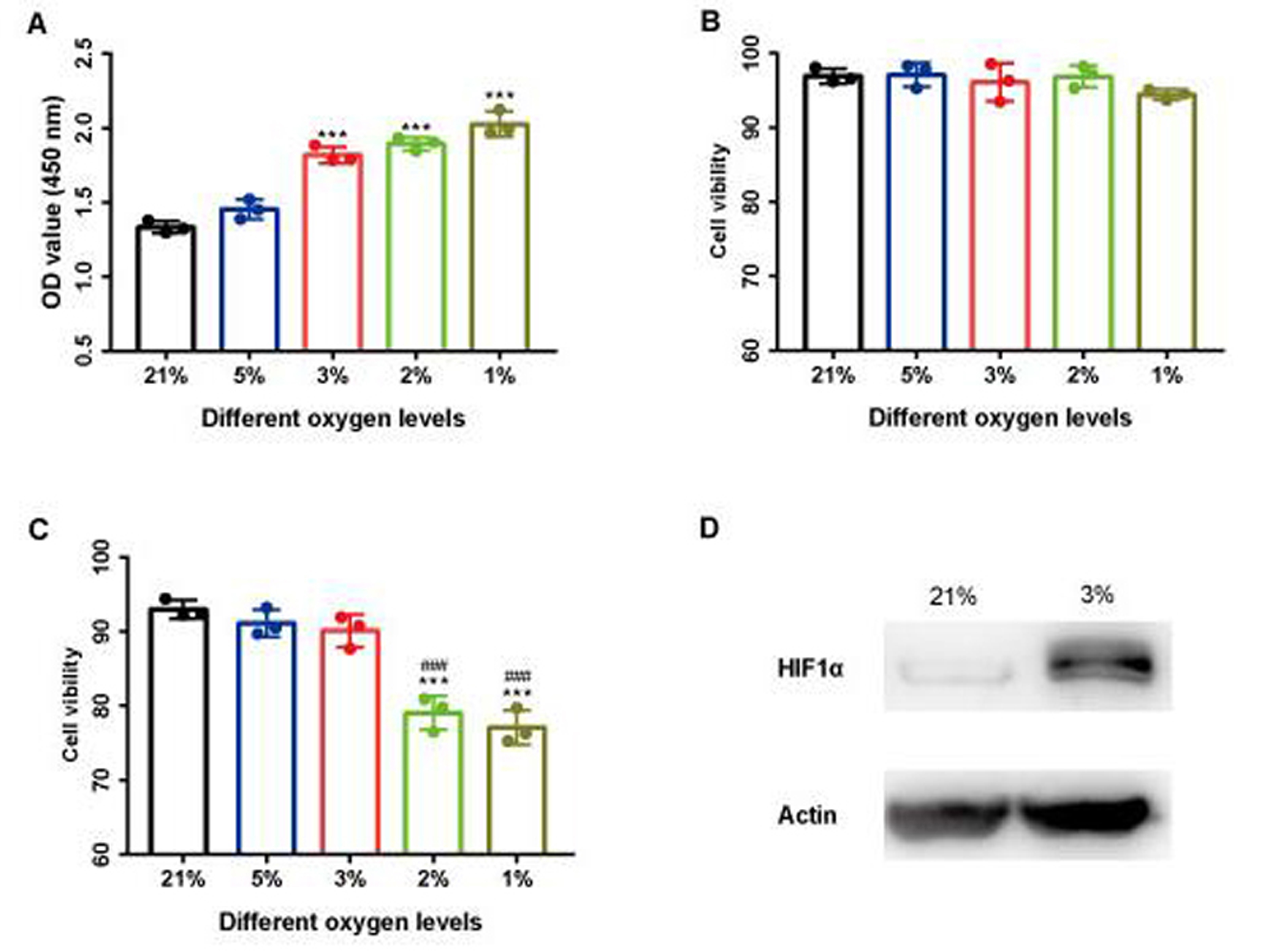 (A) A375 proliferation under different hypoxic O2 levels. (B-C) A375 cell viability and PBMCs cell viability under hypoxic O2 levels. (D) Western Blot of HIF1α in PBMCs under 3% O2. ***P<0.001 versus 21%, ###P<0.001 verse 3% n=3.