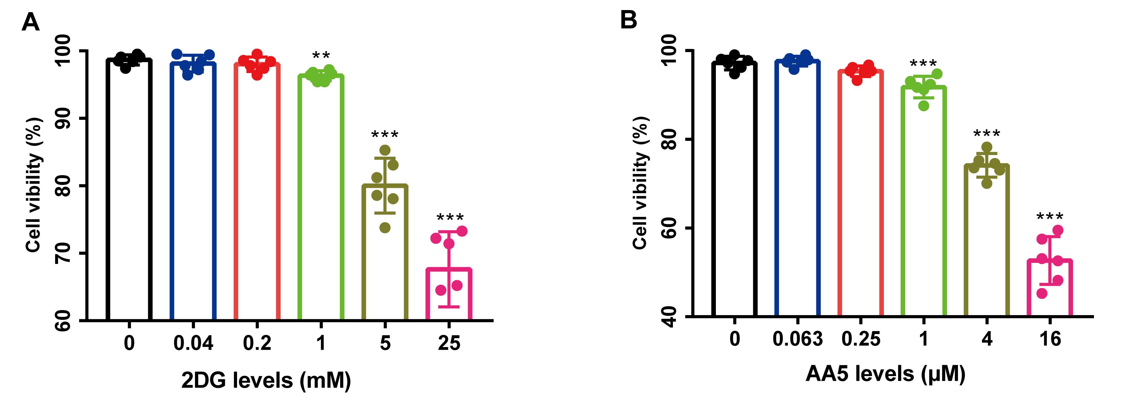 (A-B) 2DG and AA5 levels were determined via PBMC viability. **P<0.01, ***P<0.001 versus 0, n=3.