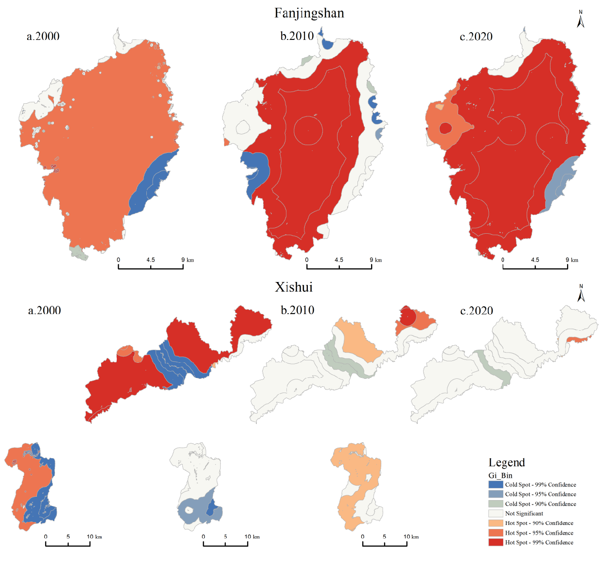 The Getis-Ord Gi* statistical index in ArcGIS was the basis for a hotspot analysis method that was used to find habitat quality (Hotspots) and low value clustering (cold spots) in nature reserves. The interaction zones between hotspots and coldspots in nature reserves may result from developmental activities near major transportation routes and tourist facilities, leading to localized declines in habitat quality. For example, in Fanjingshan National Nature Reserve, habitat-quality hotspots areas were primarily concentrated in the core of the reserve, while coldspots areas were mainly distributed along the periphery, reflecting pressures from human activity at the periphery. In Rongjiang Moon Mountain Nature Reserve, habitat-quality hotspots showed a fragmented pattern in 2000 but evolved into a continuous distribution centered around coldspots by 2020, suggesting better habitat protection within the reserve resulting from reduced human activities (Figs. S1 to S3). Overall, from 2000 to 2020, most of the habitat-quality changes in the 33 nature reserves showed a trend of spatial aggregation that initially weakened and then strengthened. Hotspots were mainly concentrated in the core areas of the reserves, while coldspots were predominantly observed on built-up land and certain cultivated areas at the reserve boundaries.