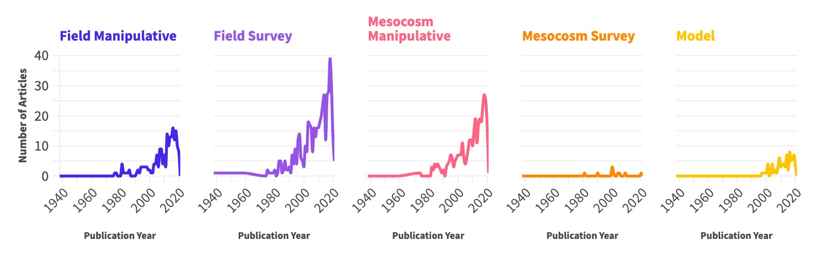 Study type included field, mesocosm, and model studies. Study design included survey and manipulative studies. Numbers may be greater than the total number of articles due to models tagged in conjunction with other study types and study designs.Publication year