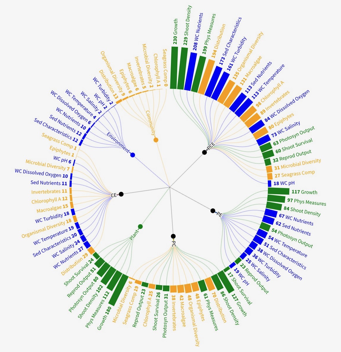 Individual type and counts of each response variable were sorted into categories of plant, community, and environment recorded in combination by each included article. Combinations included: Plant, Community, or Environment only; Plant & Community (PC); Plant & Environment (PE); Community & Environment (CE); or Plant, Community, & Environment (PCE).