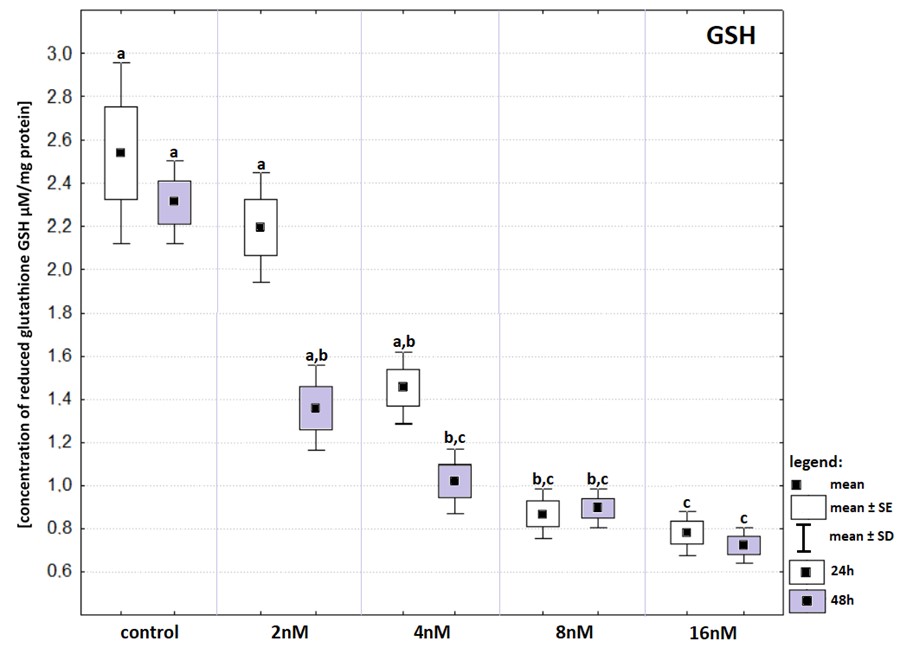The concentration of reduced glutathione was determined using the Sigma Aldrich Glutathione Assay Kit (Darmstadt, Germany). Fluorometric test (CS0260 1 KT) was performed using the TECAN ELISA microplate reader at the wavelength λ = 412 nm. Total protein concentration was determined according to the method by Lowry et al. (1951). The GSH concentration was expressed in µM/mg protein.