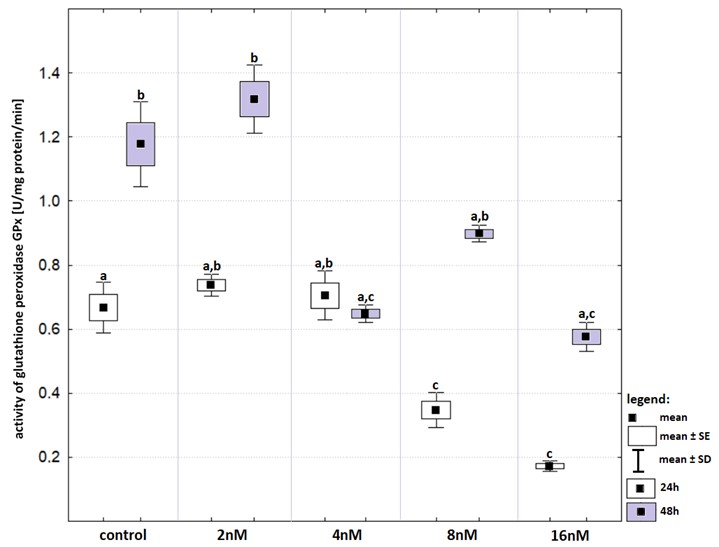Activity of glutathione peroxidase (in relation to that recorded in control groups) in cell lines exposed to bortezomib at concentrations of 2 nM, 4 nM, 8 nM and 16 nM for 24-hours (white boxes) and 48-hours (grey boxes). Values are presented as mean ±SE and mean ±SD. Letters indicate groups that differ significantly from each other (p < 0.05, Kruskal–Wallis test and Dunn’s test as a post hoc); (a) significantly different from values marked with letters b and c; (b) significantly different from values marked with letters a and c; (ab) significantly different from values marked with letter c; (ac) significantly different from values marked with letter b.