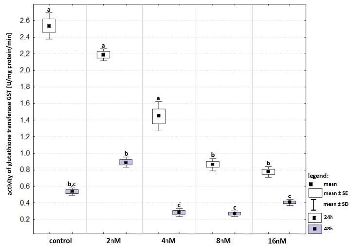In control group as well as in all experimental groups incubation time affected GST activity (Fig. S3). The 48-hours incubation induced significant decrease in GST activities comparing to those recorded after 24-hours. Bortezomib at concentrations of 8 nM and 16 nM reduced significantly the activity of GST, compared to that in control group, as well as in groups with bortezomib at concentrations of 2 nM and 4 nM after 24-hours incubation. However, after the prolonged exposure, bortezomib at concentrations of four, eight and 16 nM reduced GST activity compared to that recorded at the concentration of two nM.
