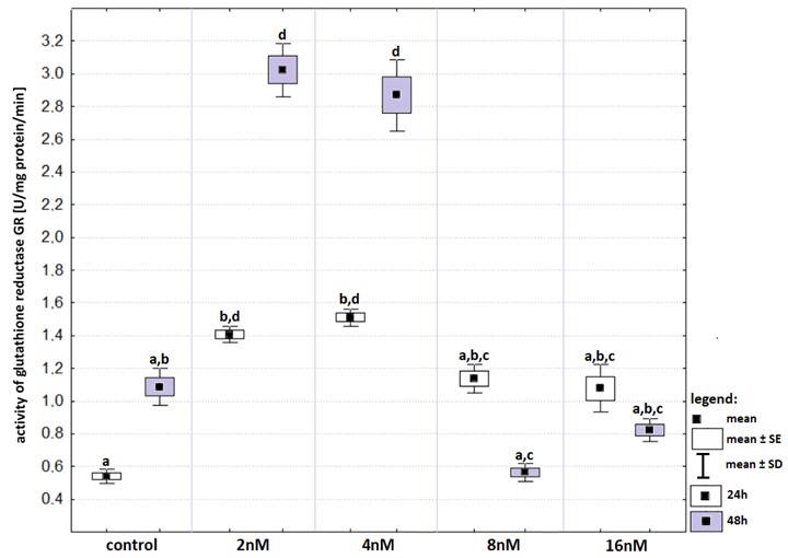 Activity of glutathione reductase (in relation to that recorded in control groups) in cell lines exposed to bortezomib at concentrations of 2 nM, 4 nM, 8 nM and 16 nM for 24 -hours (white boxes) and 48-hours (grey boxes)