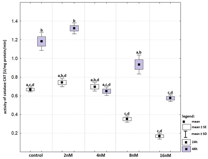 Activity of catalase (in relation to that recorded in control groups) in cell lines exposed to bortezomib at concentrations of 2 nM, 4 nM, 8 nM and 16 nM for 24-hours (white boxes) and 48-hours (grey boxes)