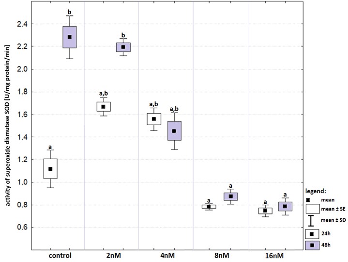 Activity of superoxide dismutase (in relation to that recorded in control groups) in cell lines exposed to bortezomib at concentrations of 2 nM, 4 nM, 8 nM and 16 nM for 24 -hours (white boxes) and 48-hours (grey boxes)