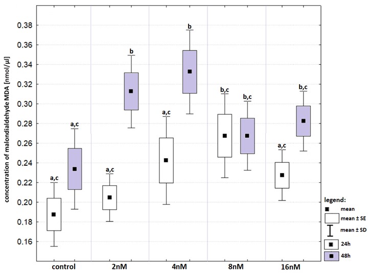 The highest levels of MDA concentration were recorded in groups treated with bortezomib at concentrations of two nM and four nM after 48-hours incubation (Fig. S7). In both cases the concentration of MDA was significantly higher than that in the control group. In neither group, a 24-hours incubation resulted in an increase in MDA concentration.