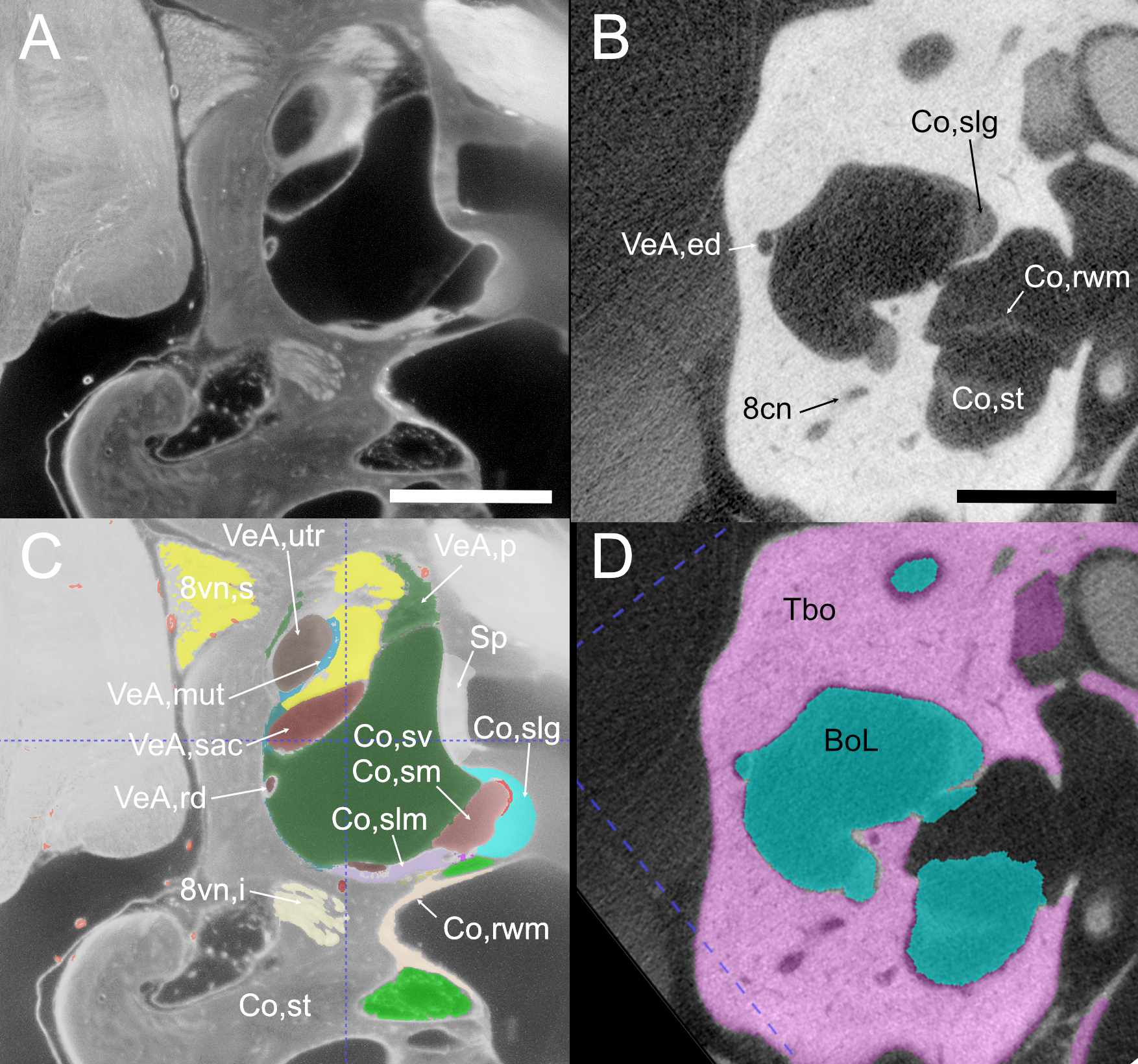 A: single optical section of Rat B showing autofluorescence signal. Scale bar: 1 mm. B: single section of microCT stack displaying bone and several soft tissue elements, such as the round window. Scale bar: 1 mm. C, D: same as A, B but with annotated segmentations added. 8cn: cochlear nerve, 8vn: vestibular nerve (i: inferior, s: superior), BoL: bone labyrinth, Co: cochlea (rwm: round window membrane, slg: spiral ligament, slm: spiral limbus, sm: scala media, st: scala tympani, sv: scala vestibuli), Sp: stapes, TBo: temporal bone, VeA: vestibular apparatus (ed:endolymphatic duct, mut: macula utriculi, p:perylimph, rd: reuniting duct, sac: saccule, utr: utricle).
