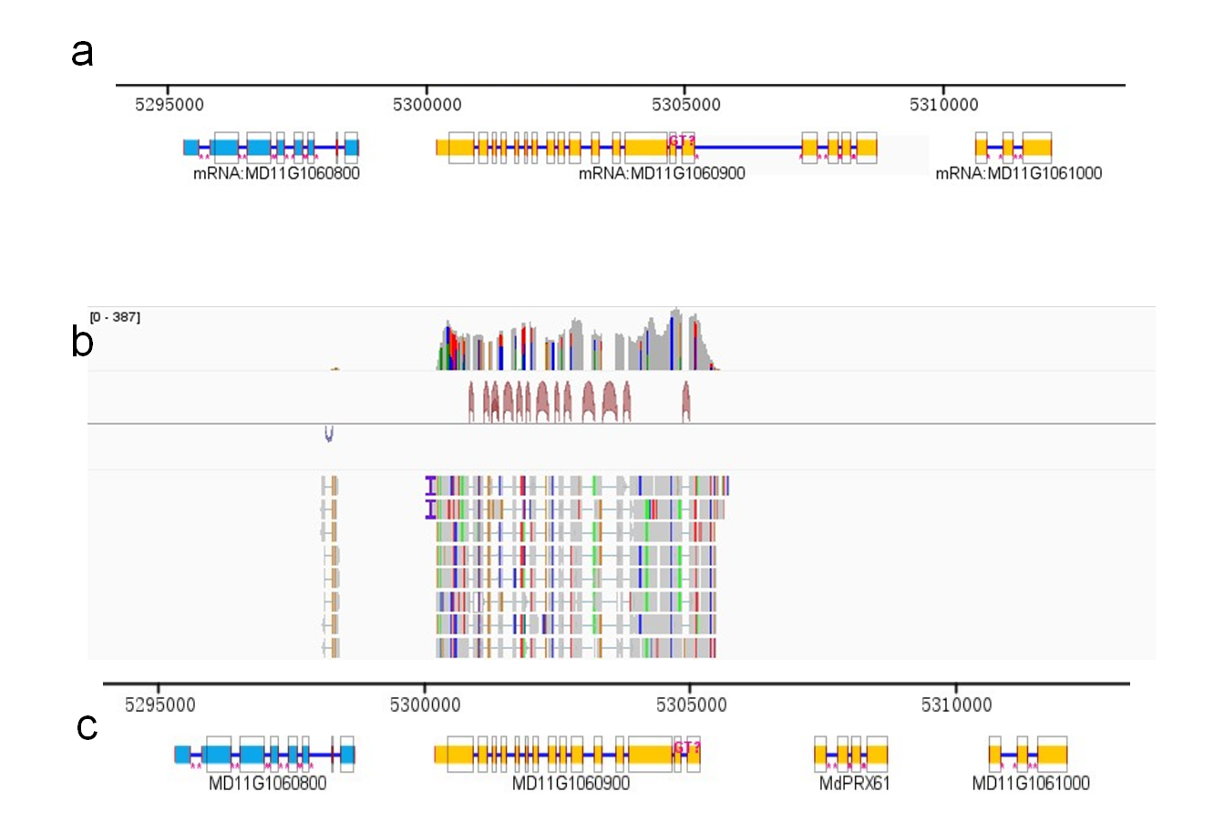 (a) the original annotation of MD11G106900 which predicted to be MdPRX61, it has 19 exons but there is no peroxidase domain in the first 15 exons (b) the RNA-Seq read mapping to mRNA MD11G106900 showed that the first 15 exons were expressed independently (c) the revised annotation of MdPRX61 by dividing the original MD11G106900 into two separate transcripts, the last four exons (16-19 exons) which contain a signal peptide and a peroxidase domains were renamed as MdPRX61.